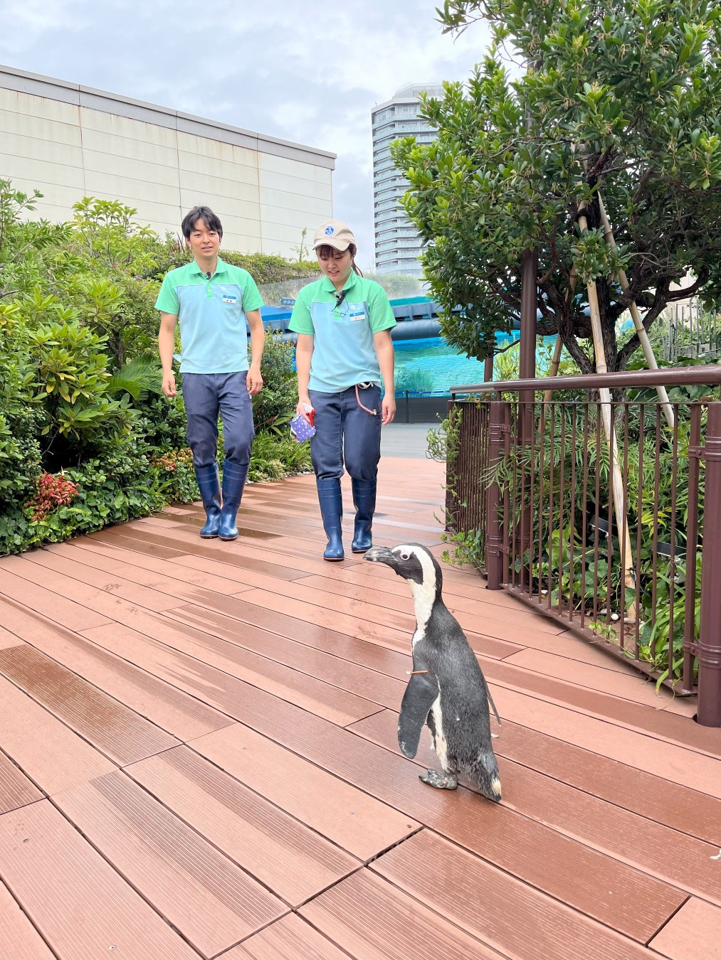 基本的にはペンギンに自由に歩いてもらいますが、飼育スタッフの後ろをついて歩くようにトレーニングを重ねました。