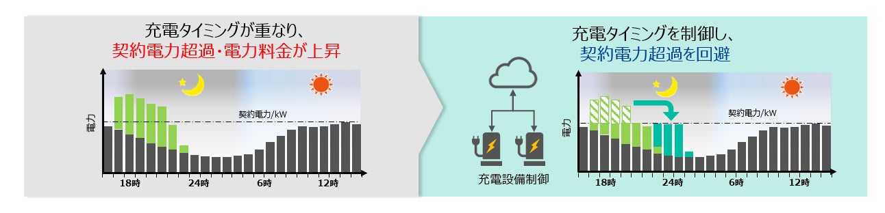 ※建物の電気使用状況やEVの電池残量等の情報を基に、EVの充電タイミングを制御すること。電力需要ピークの平準化や電気料金の削減が可能。
