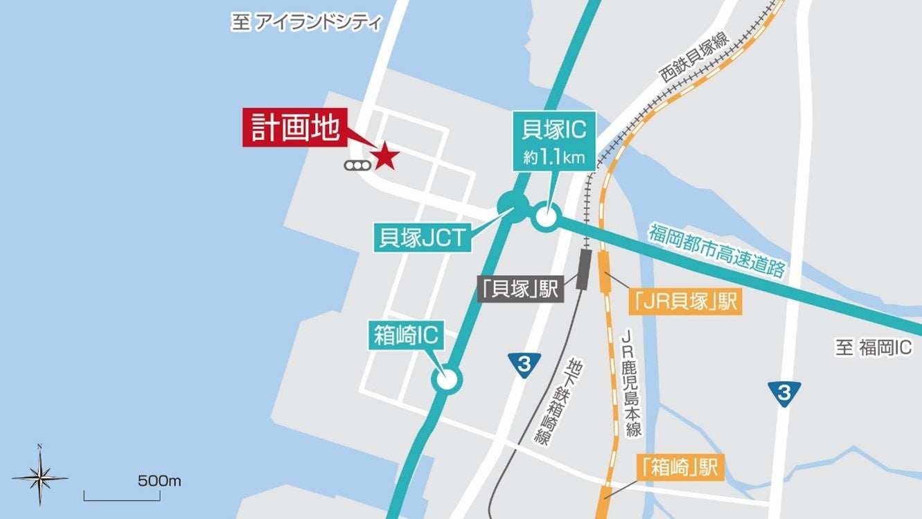 本用地は、九州の海の玄関口である博多港に面した箱崎ふ頭内に位置し、国際貨物の保管等に非常に優れたエリアです。また、福岡都市高速道路「貝塚インターチェンジ」から約1.1kmに位置し、九州自動車道「福岡インターチェンジ」を経由することで、九州全域への広域輸送が可能な物流拠点として高い需要が見込まれます。