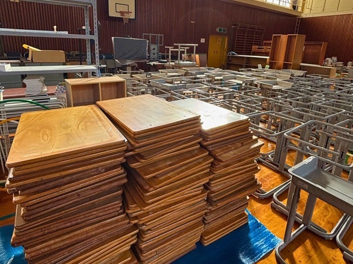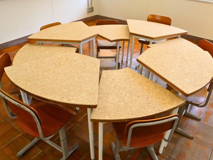 リサイクルが難しいメラミン(樹脂)付きの机の天板を、2025年4月開校の学園内で再利用