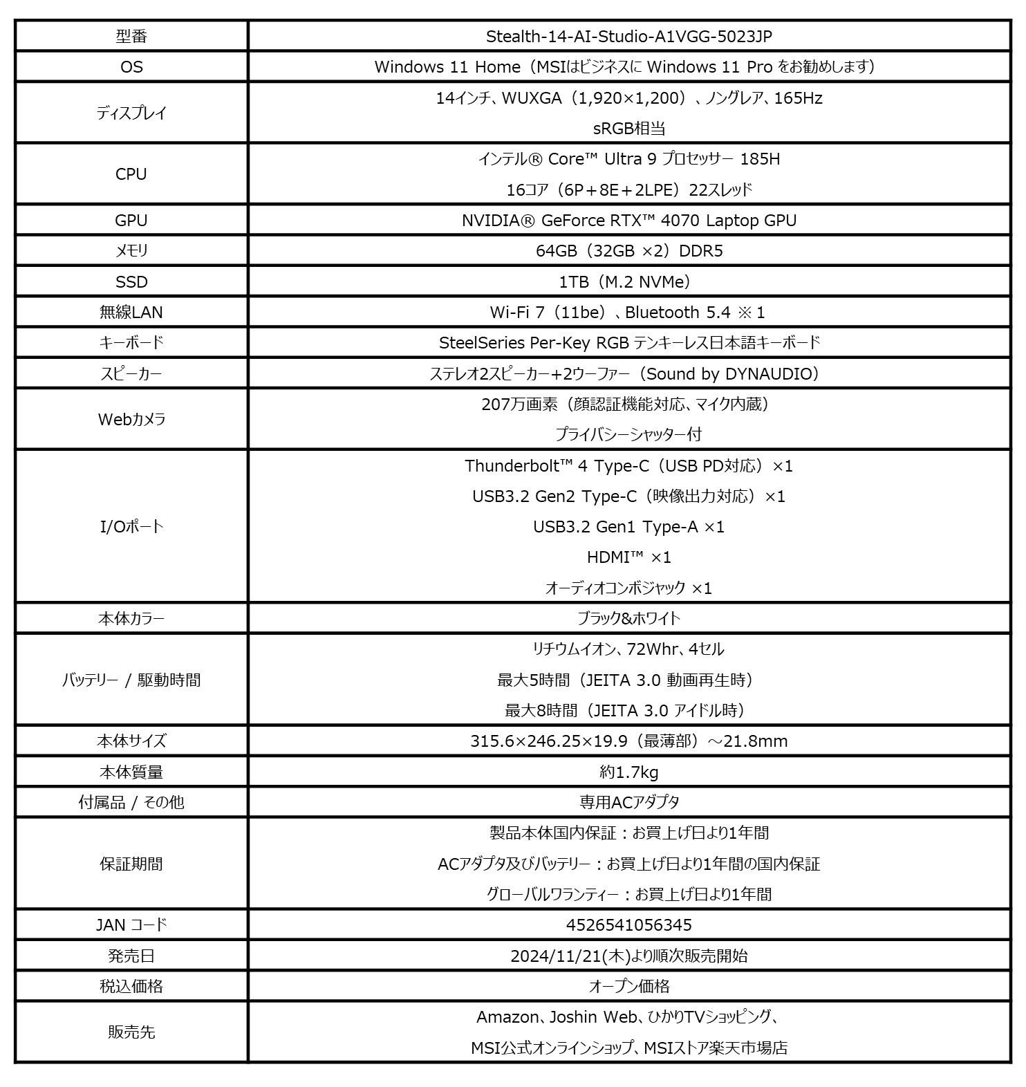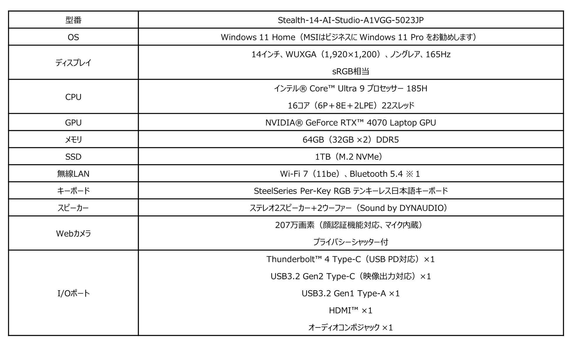 https://jp.msi.com/Laptop/Stealth-14-AI-Studio-A1VX
