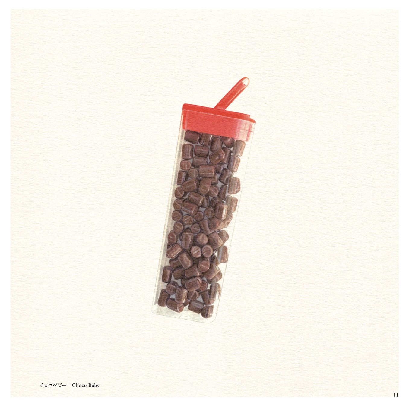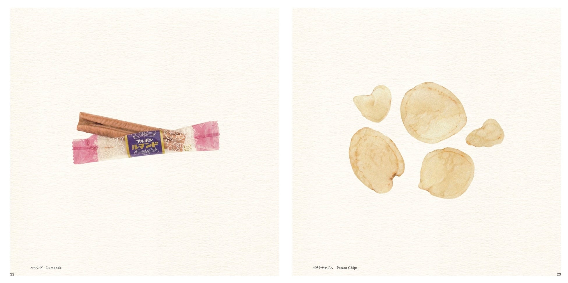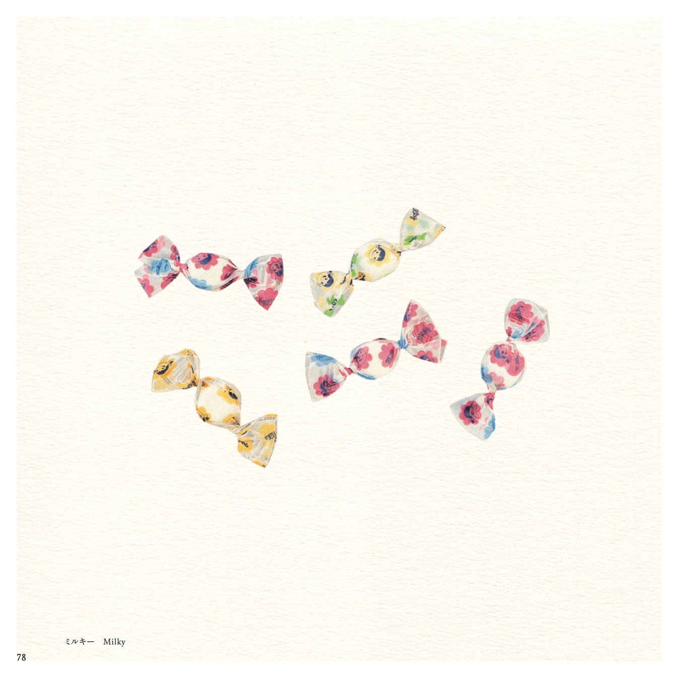 食感を予感させるような「源氏パイ」のパイ生地の軽やかな層、カラフルな包装紙のやわらかな質感とその中に確かにある「ミルキー」の存在感、小さなチョコレートがたっぷり詰まった「チョコベビー」のプラスチック容器の透明感、「ジャイアントカプリコ」のあの唯一無二のエアリーな食感が伝わる表面の質感……。ぜひ本書をご覧になってご確認ください。