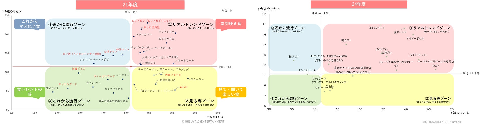 特に顕著な変化としては、2021年調査においてリアルトレンドゾーンに「おうちカフェ」「おうち居酒屋」など自宅で楽しめるものが多い傾向にありましたが、2024年調査では行列で話題の「生ドーナツ」や「夜カフェ」など、食べ歩きや外食を伴うコンテンツが多く挙げられました。見る専ゾーンでは2021年調査に比べて母数が減少し、新しい食トレンドに対して積極的になっていることがわかります。密かに流行ゾーンやこれから流行ゾーンでは揺らしてプルプル感を楽しむ「猫プリン」や、推しの生誕を祝う「センイルケーキ」、推しのキャラクターの形を再現したり、アイテムを載せて作る「キャラケーキ」などがカテゴライズされ、2021年の「ヌン活(アフタヌーンティ活動)」「台湾チキン」などよりもオリジナリティのある体験を伴う食コンテンツが多数を占める傾向となりました。