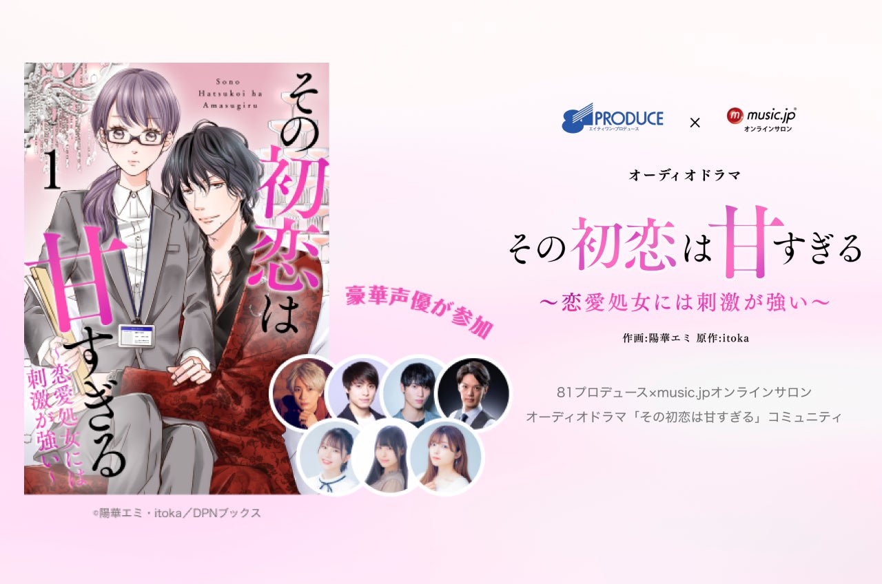 数多くの人気声優を抱える大手声優事務所81プロデュースと、『music.jpオンラインサロン』がタッグを組んだプロジェクト型エンターテインメント・コミュニティがスタートします。人気コミック『その初恋は甘すぎる~恋愛処女には刺激が強い~』を原作としたオーディオドラマを期間限定で制作・公開します。オーディオドラマには、81プロデュース所属の人気声優が参加し、さらに主人公2人は、若手声優を対象とした公開オーディションで決定します。