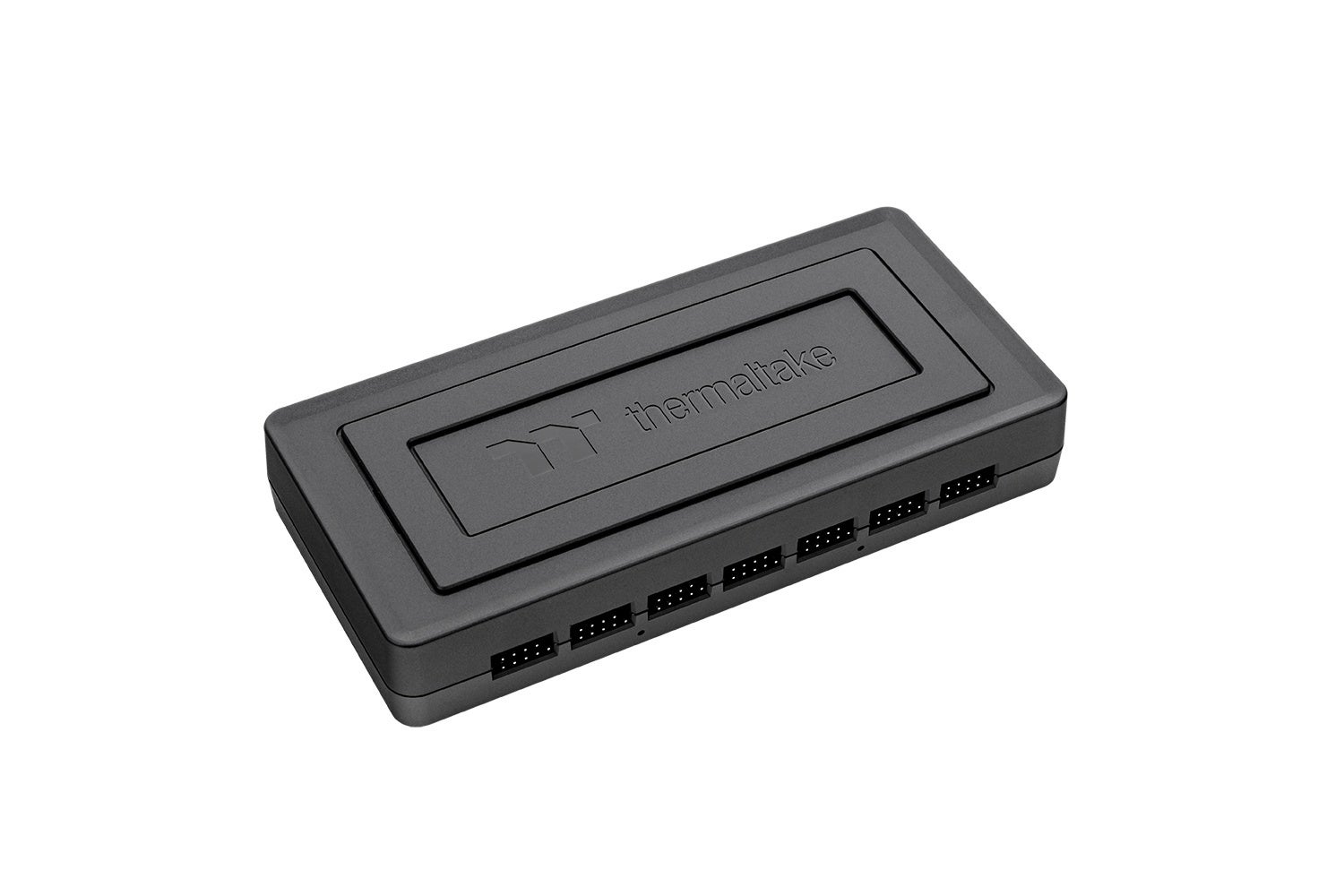 「TT Sync V2 Controller」は、最大14個のデバイス接続に対応するライティングコントローラーです。TT RGB PLUSまたは対応マザーボードのソフトウェアで一括制御可能できるほか、温度センサー内蔵デバイスにも対応しており、システムをまとめてコントロールすることができます。