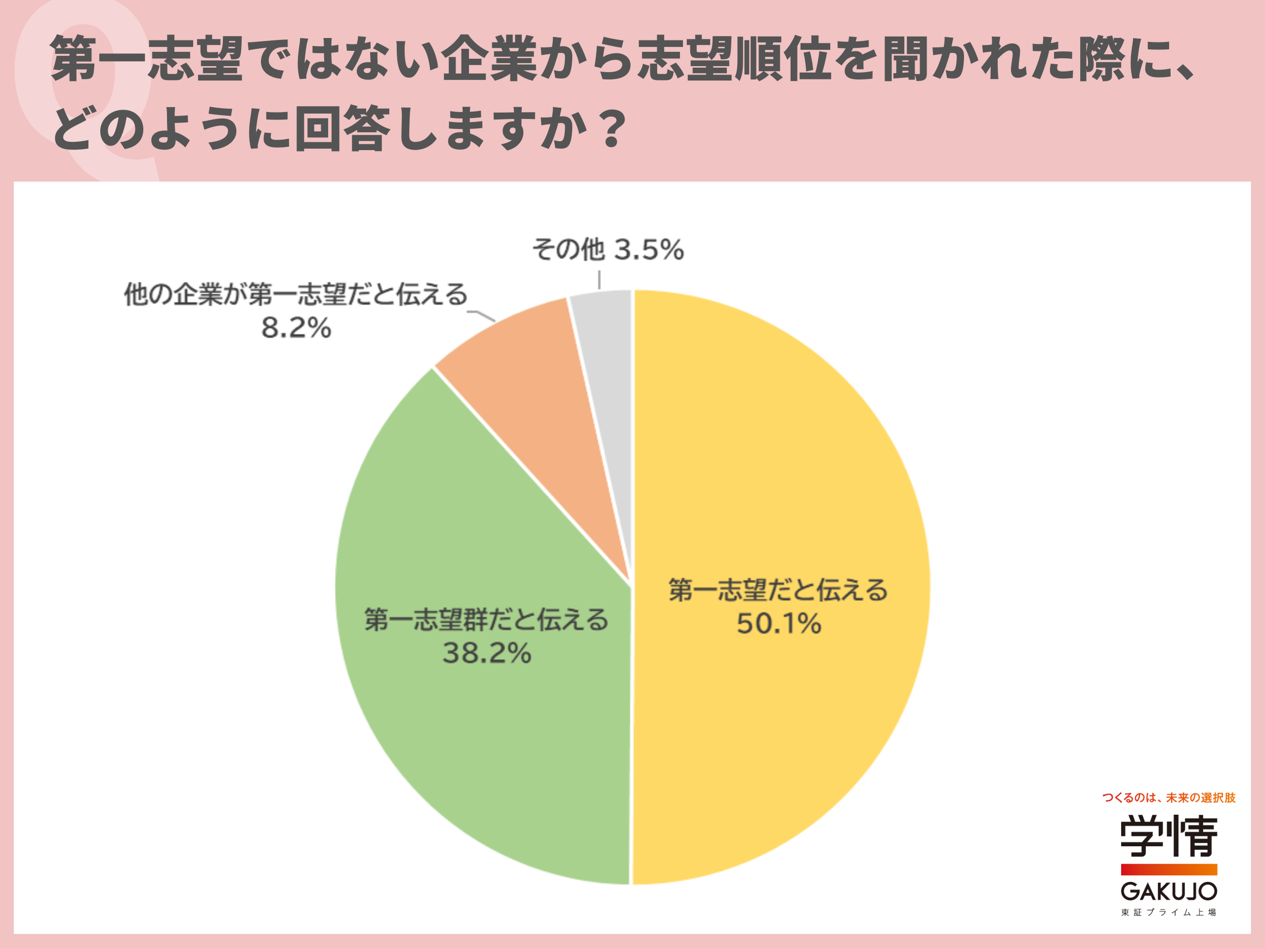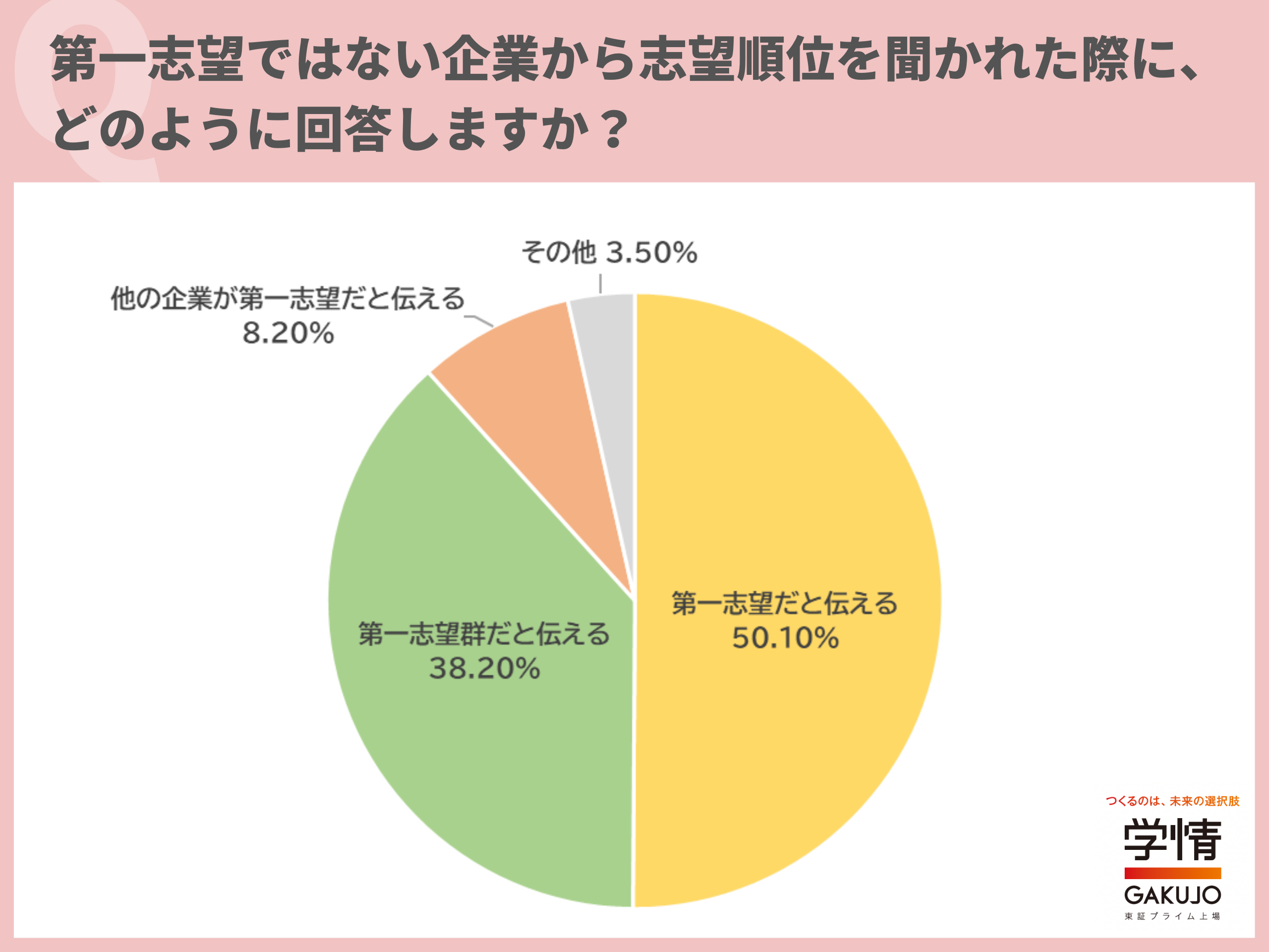 第一志望でない企業から志望順位を聞かれた際の回答について、「第一志望だと伝える」とした学生は50.1%でした。「選考は志望度の高い企業のみ受けている。全ての企業を第一志望のつもりで受験し、内々定を獲得してから入社する企業を決めたい」「本当に入社したい企業に絞って選考に参加しているので、選考を受けている企業は、どの企業も第一志望だと言える」などの声が寄せられました。