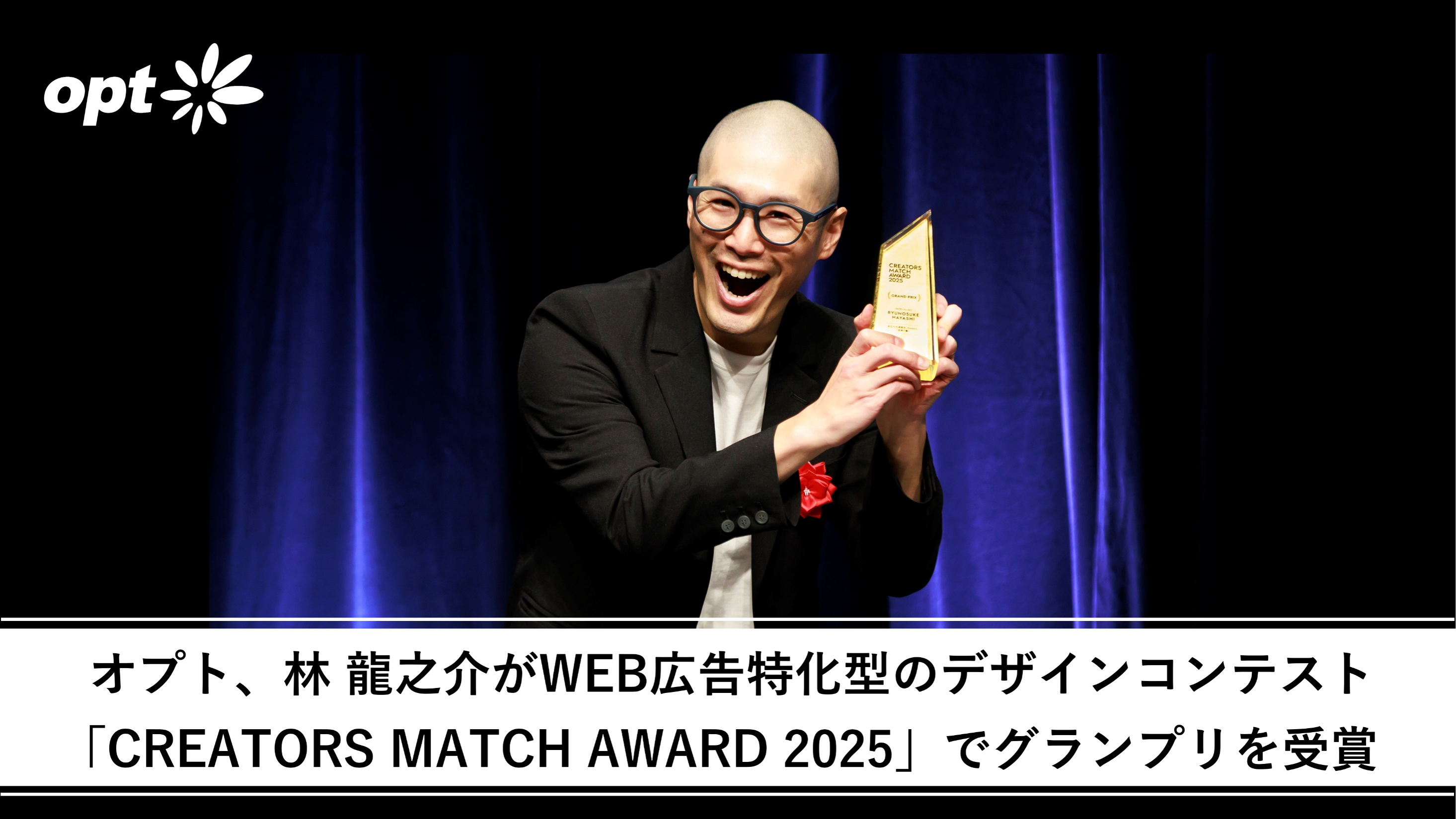 「新しい価値創造を通じて産業変革を起こし、社会課題を解決する。」をパーパスに掲げ、LTVM(LTV Marketing)(※1)により、顧客の事業成長を先導する株式会社オプト(本社:東京都千代田区、代表取締役社長:金澤 大輔、以下 オプト)は、株式会社クリエイターズマッチ(本社:東京都港区、代表取締役:呉 京樹、以下 クリエイターズマッチ)が主催する、WEB広告特化型のデザインコンテスト「CREATORS MATCH AWARD 2025」(以下、本コンテスト)にて、オプト AIクリエイティブセンター(※2) 林 龍之介(はやし りゅうのすけ)が、「GRAND PRIX(グランプリ)」を受賞したことをお知らせいたします。林は、協賛企業賞もあわせて受賞しております。