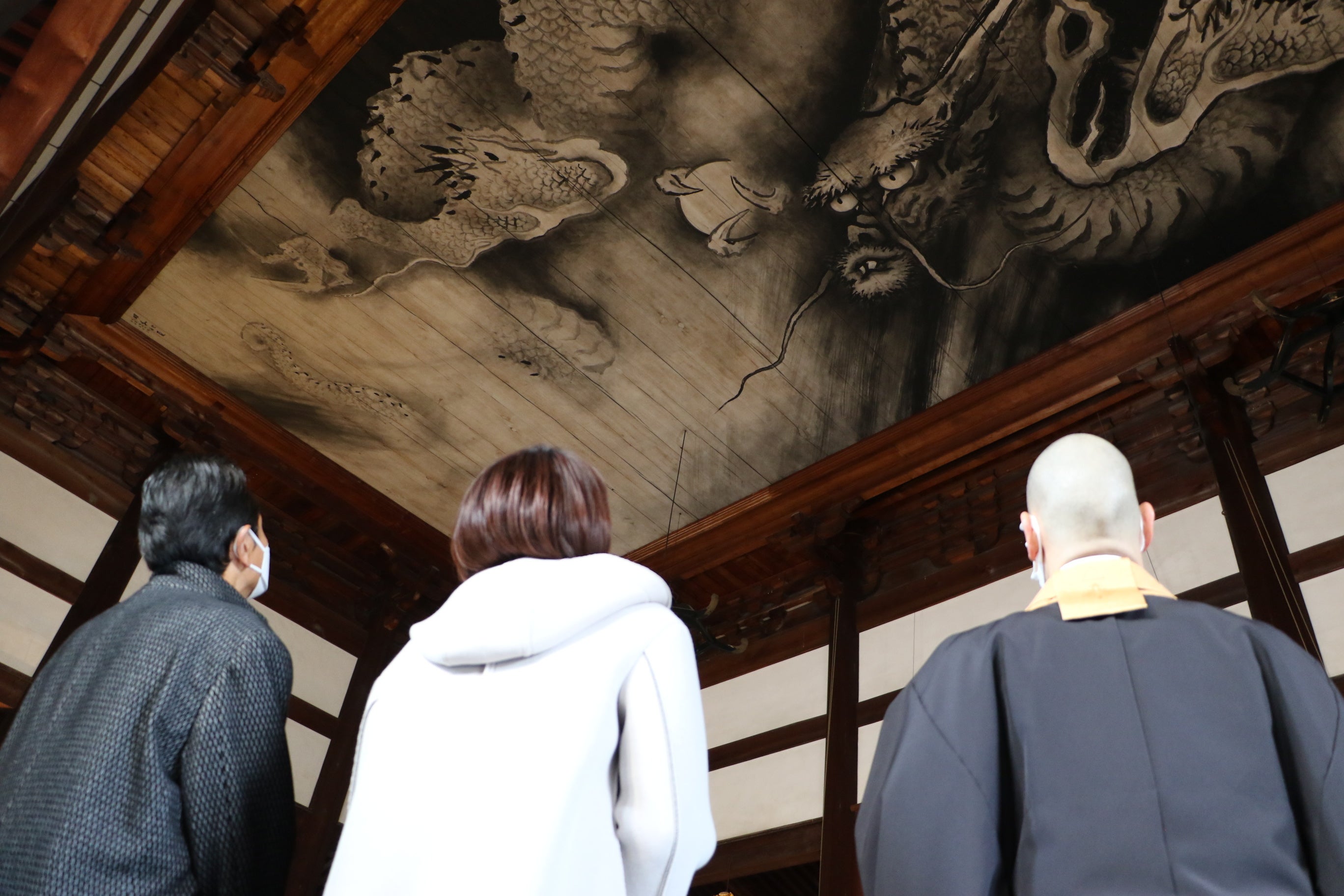 続いて訪れたのは祇園。普段非公開の建仁寺の塔頭・正伝永源院。織田信長の弟で茶人としても名を馳せた織田有楽斎の茶室を見学します。