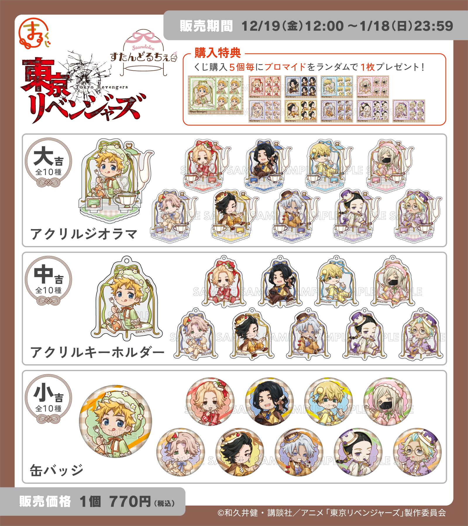各賞の商品といたしましては、アクリルジオラマ、アクリルキーホルダー、缶バッジと、ファンの皆様に喜んでいただけるラインナップとなっております。