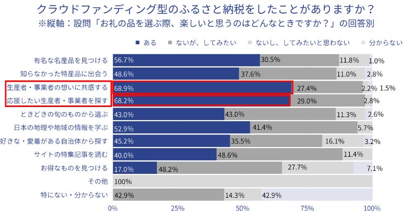 ふるさと納税を通じた「生産者・事業者支援」が楽しいと感じる層は、ほかの層よりもクラウドファンディング型ふるさと納税への認知度・利用率のいずれも高い |