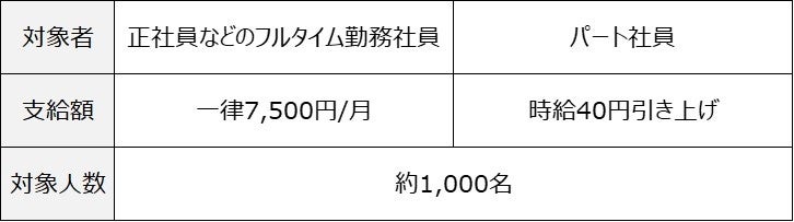 正社員などのフルタイム勤務社員は5,000円/月を支給し、パート社員は時給30円引き上げ(※1)