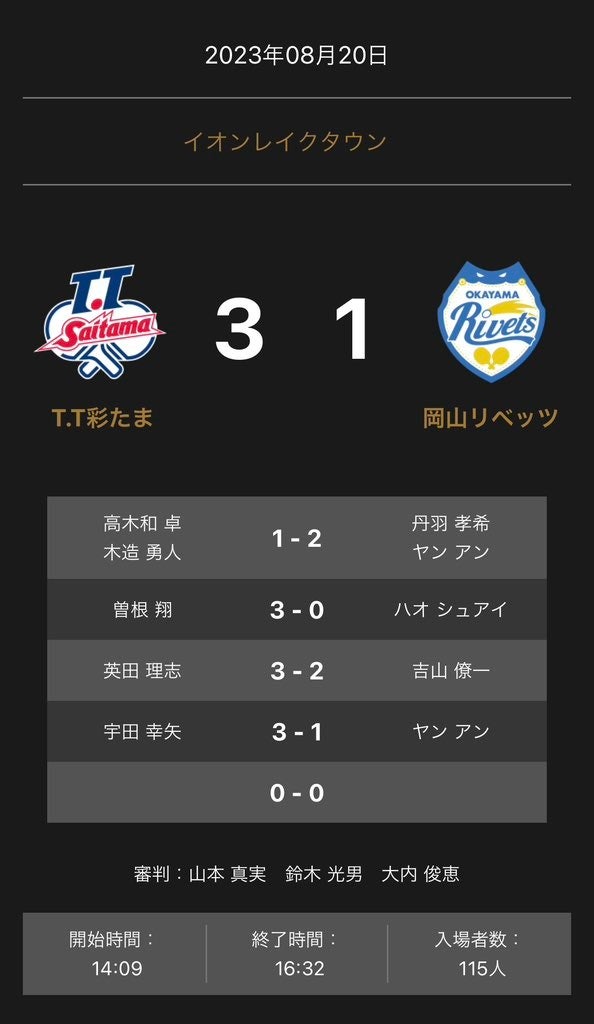 ノジマTリーグ2023-20241シーズン公式戦 8月20日(日) T.T彩たま vs 岡山リベッツ 試合結果