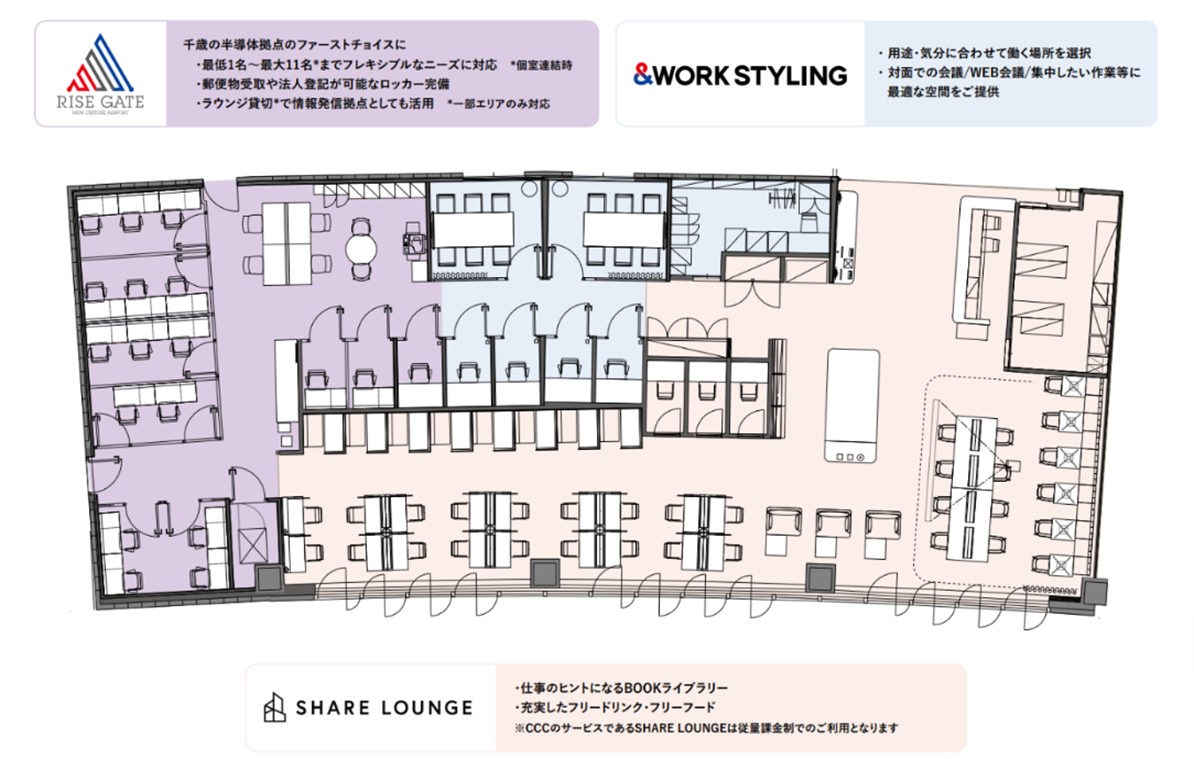 本拠点では、三井不動産が運営する「ワークスタイリング」とカルチュア・コンビニエンス・クラブ株式会社(以下「CCC」)が展開する「SHARE LOUNGE」が連携する共同モデルをベースに、RISE-Aが会員向けのサービスオフィスとコミュニティ機能を組み合わせて提供します。特に、「ワークスタイリング」としては、空港施設内では初出店となり、従来より利用ニーズの高かったエリアへの戦略的な展開となります。