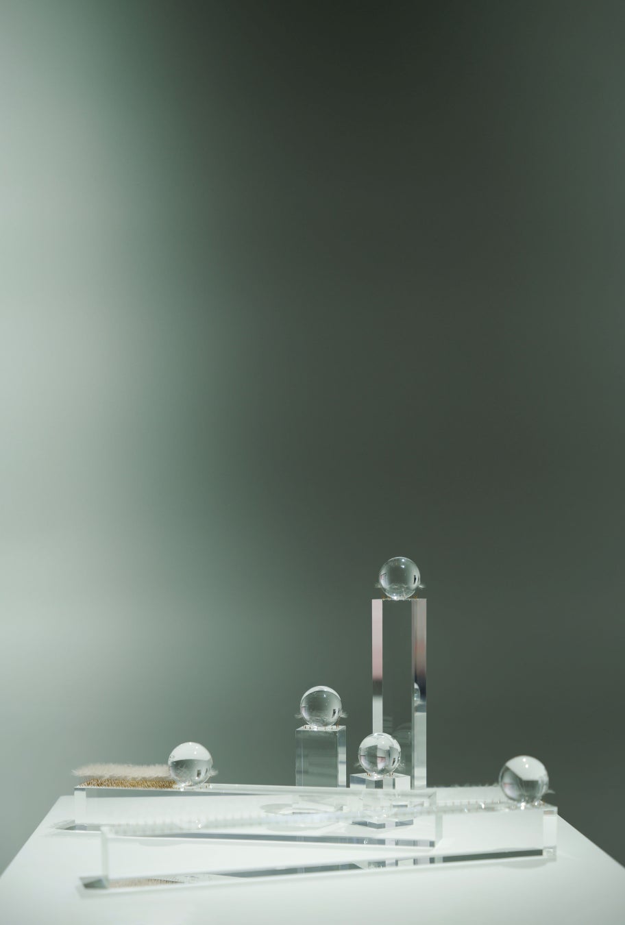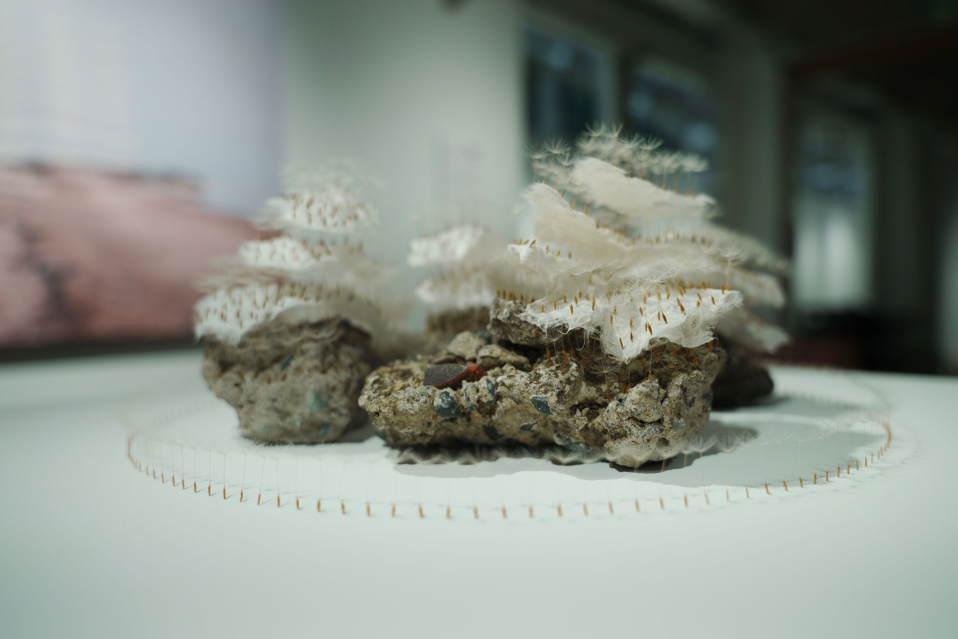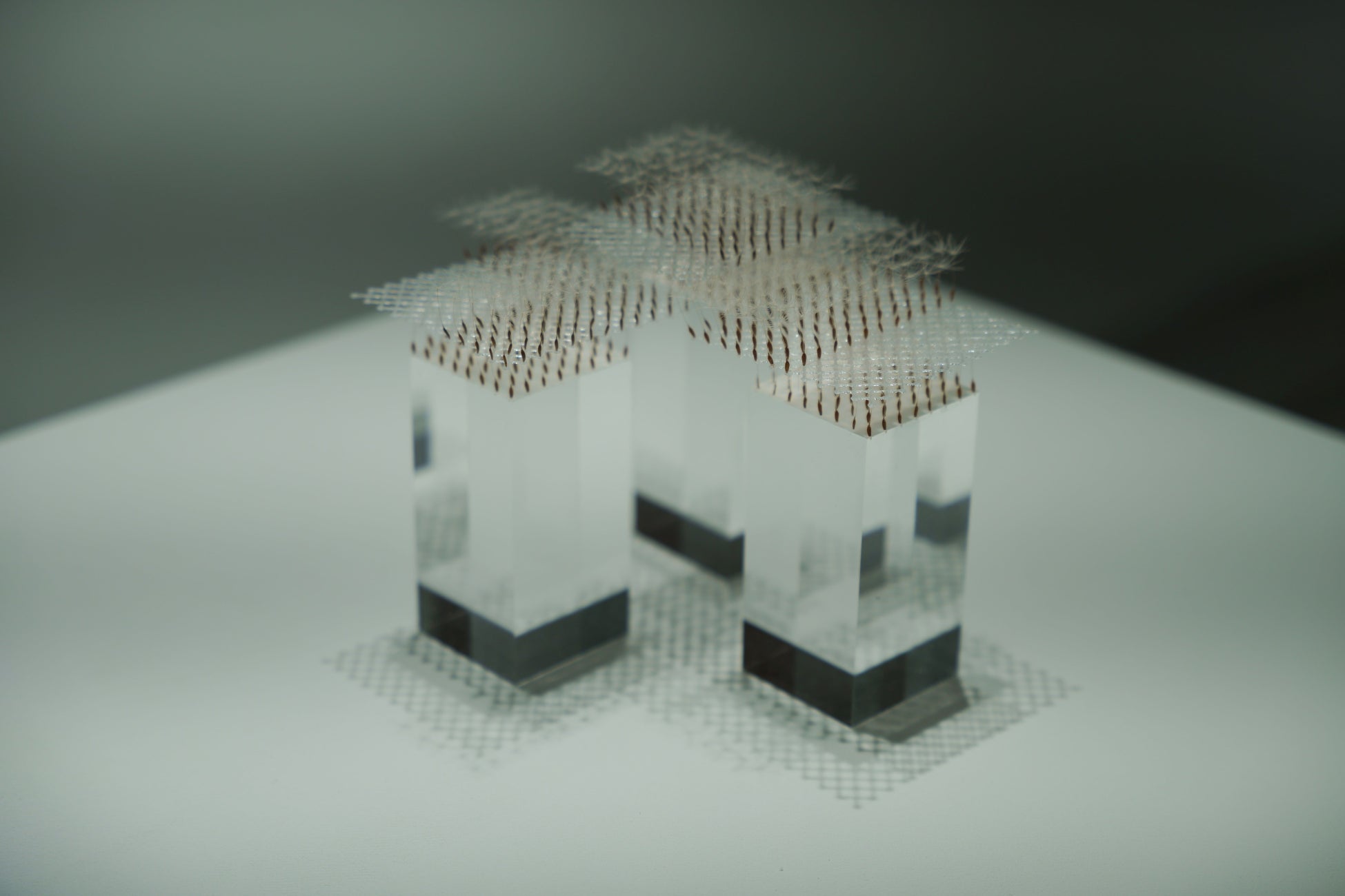 本展では、現実と夢のはざまで浮かぶ景色をかたちにした作品群を展示します。満月と綿毛の地表、どこかの建物のような構造体、カーテンのゆらめきなど、綿毛をさまざまな景色に見立てています。また今回は、「粋は生成できるのか」というテーマのもと、AIとの共作で制作した盆栽を披露します。3Dプリンタで出力した後、青沼が剪定をするようにホットナイフで形を整えました。