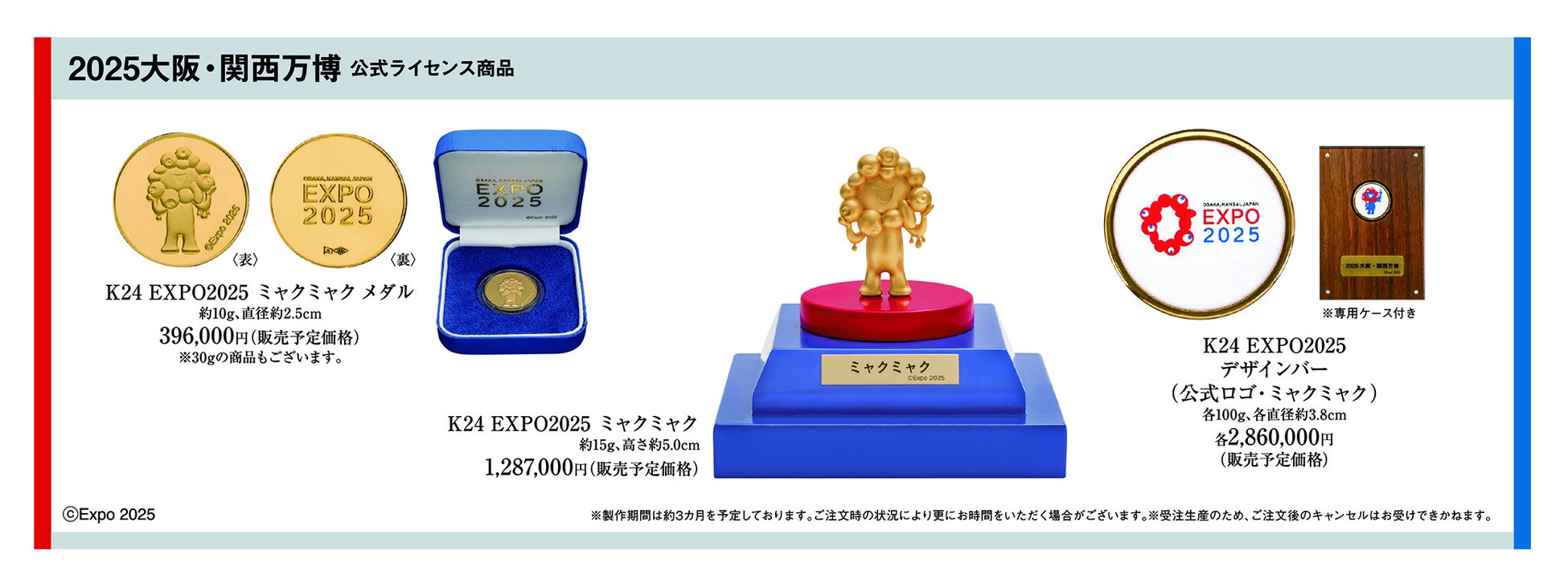 今回はパリのルーブル美術館に展示されている、世界的に有名な「ミロのヴィーナス」を忠実に再現した金箔像の特別展示もいたします。また純金の「ミャクミャク」など4月13日に開幕した『2025大阪・関西万博』公式ライセンス商品や、本年令和7年(2025年)が昭和100年目にあたることから、これを記念した小判なども展示・販売いたします。