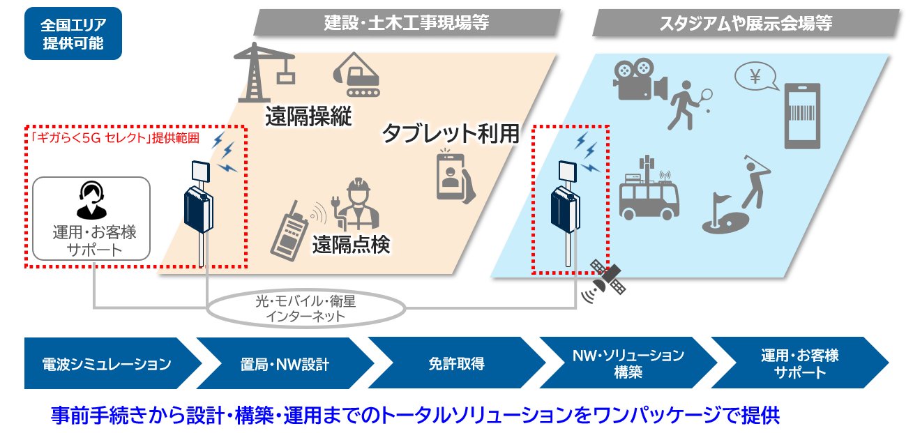 一方で、ご利用エリア内にサーバ等機器類の設置場所が無い建設現場等の屋外環境や、光回線によるインターネットアクセス環境の確保が困難なエリアでも「ギガらく5G」を利用したいというお声を多くいただいておりました。