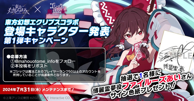 株式会社ケイブ(本社:東京都目黒区、代表取締役社長:秋田英好、証券コード:3760)が配信中のシューティングゲームアプリ『ゴシックは魔法乙女~さっさと契約しなさい!~』(『ごまおつ』)におきまして、7月18日(木)より開催予定の『東方幻想エクリプス』(『ゲンリプ』)とのコラボイベントに先立ち、コラボイベントにて登場するキャラクター第1弾を発表いたしました。また、発表を記念して実施するサイン色紙プレゼントキャンペーンもあわせてご紹介いたします。
