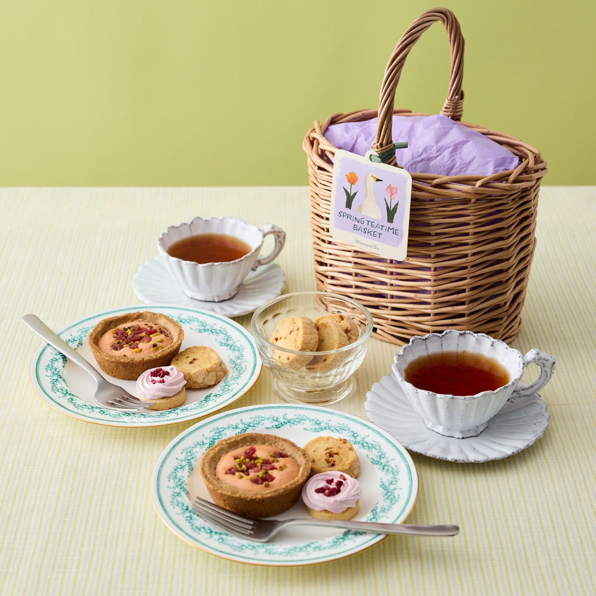 春限定のお茶とお菓子を手編みのバスケットに詰め合わせました。お花見やピクニックにぴったりです。