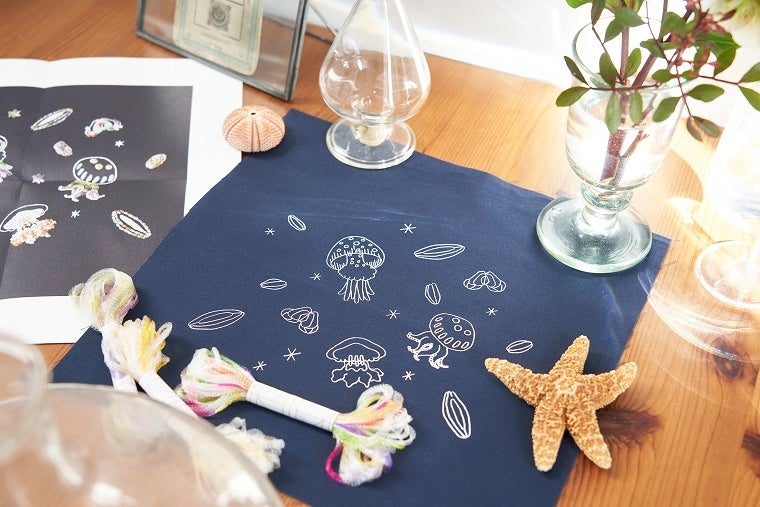 第一弾は、「きらきら」「もふもふ」「ふかふか」の3種の糸。atsumiさんデザインによるオリジナルの図案、指示書はじめ、刺繍に必要な道具がキットになっているので、慣れない方でも気軽に始められます。