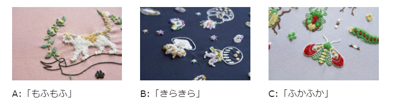A:「もふもふ」、B:「きらきら」、C:「ふかふか」