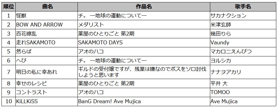アニソンの全世界的なグローバルヒット、バイラルヒットを受けてJ-POPシーンのビッグアーティストがこぞってアニメ主題歌を手がけるようになって久しい。そんな状況を、このアニメランキングを見ることでハッキリと視認することができるわけだが、日本のロックシーンにおける最重要バンドと言っても過言ではないサカナクションによる初のTVアニメ主題歌である「怪獣」が堂々の1位を獲得。サカナクションにとって2年間の活動休止を挟んだ新曲、という待望感も相まって競合を押さえ込んだ。ヨルシカ「へび」も6位にランクインしていることから、2025年冬アニメの覇権は『チ。 ―地球の運動について―』が握ったと言っていいだろう。