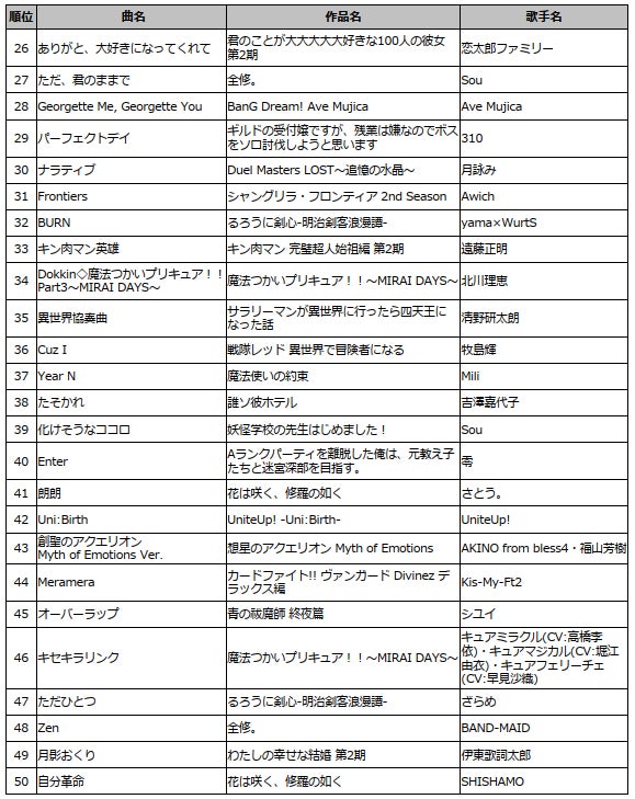 ■通信カラオケDAM 2025年冬アニメ主題歌 カラオケランキング TOP50(26位~50位)