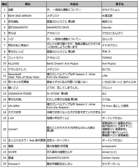 ■通信カラオケDAM 2025年冬アニメ主題歌 カラオケランキング TOP50(1位~25位)
