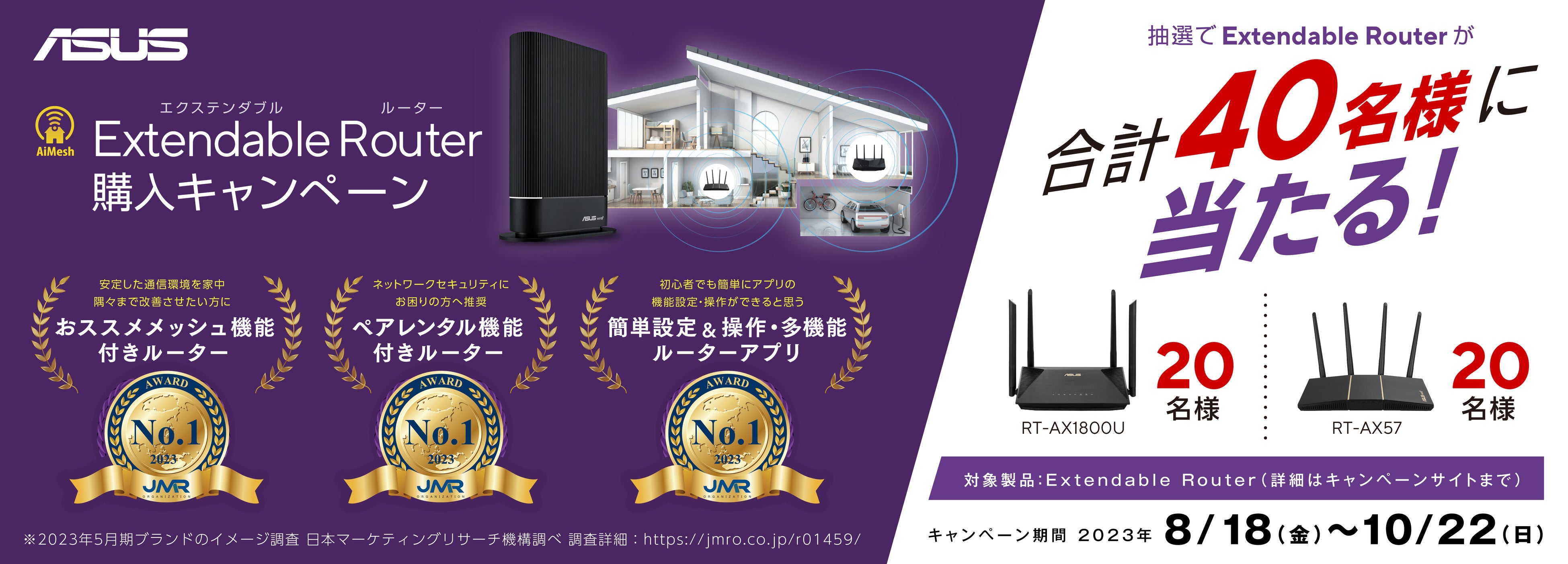 ASUSの対象のルーターを購入して応募した方の中から抽選で合計40名様にMesh構築ができるルーターが当たる「Extendable Router購入キャンペーン」の開催を発表