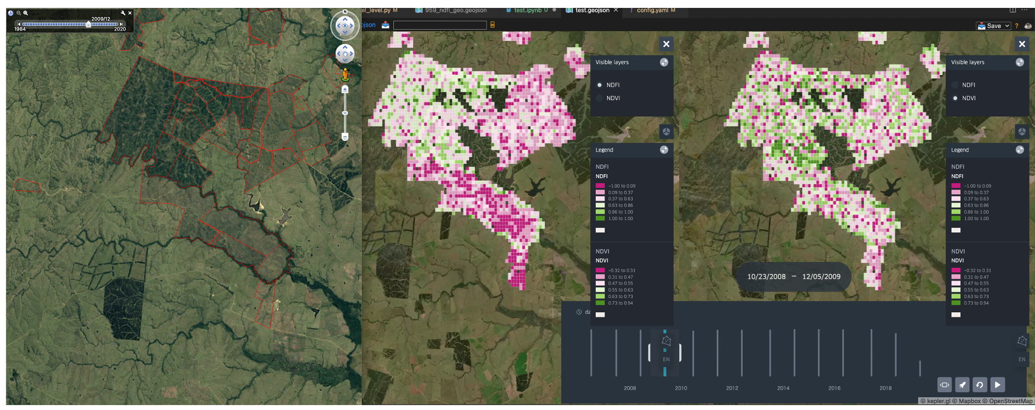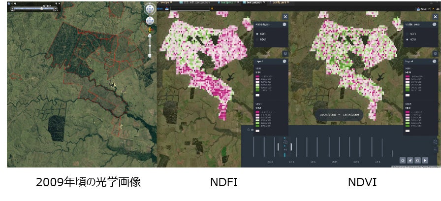 *6:ピンク色ほど植生が少なく、緑色が濃いほど植物の量や活力が高い状態を表す。画像の例ではウルグアイの植林地を15年間程度に渡り評価した結果。NDVI(Normalized Difference Vegetation Index: 正規化植生指標)は最も一般的な植生指数の一つで、森林被覆を示す指標として用いられる。NDFI(Normalized Difference Fraction Index)は森林被覆だけでなく森林劣化を表す指標としても用いられる。