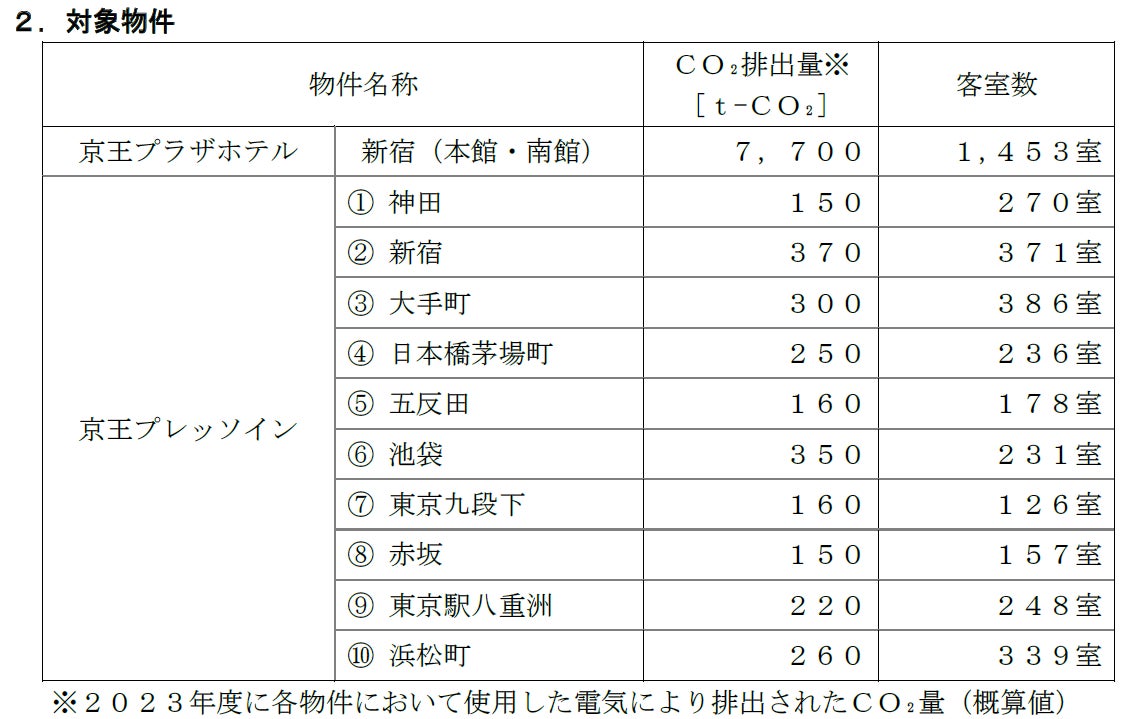 京王電鉄株式会社(本社:東京都多摩市、取締役社長:都村 智史)では、京王グループにて所有または運営管理する「京王プラザホテル(新宿)」および「京王プレッソイン(全10店舗)」を対象に、2024年8月から使用する電気の全てを実質再生可能エネルギー由来の電力に切り替えます。