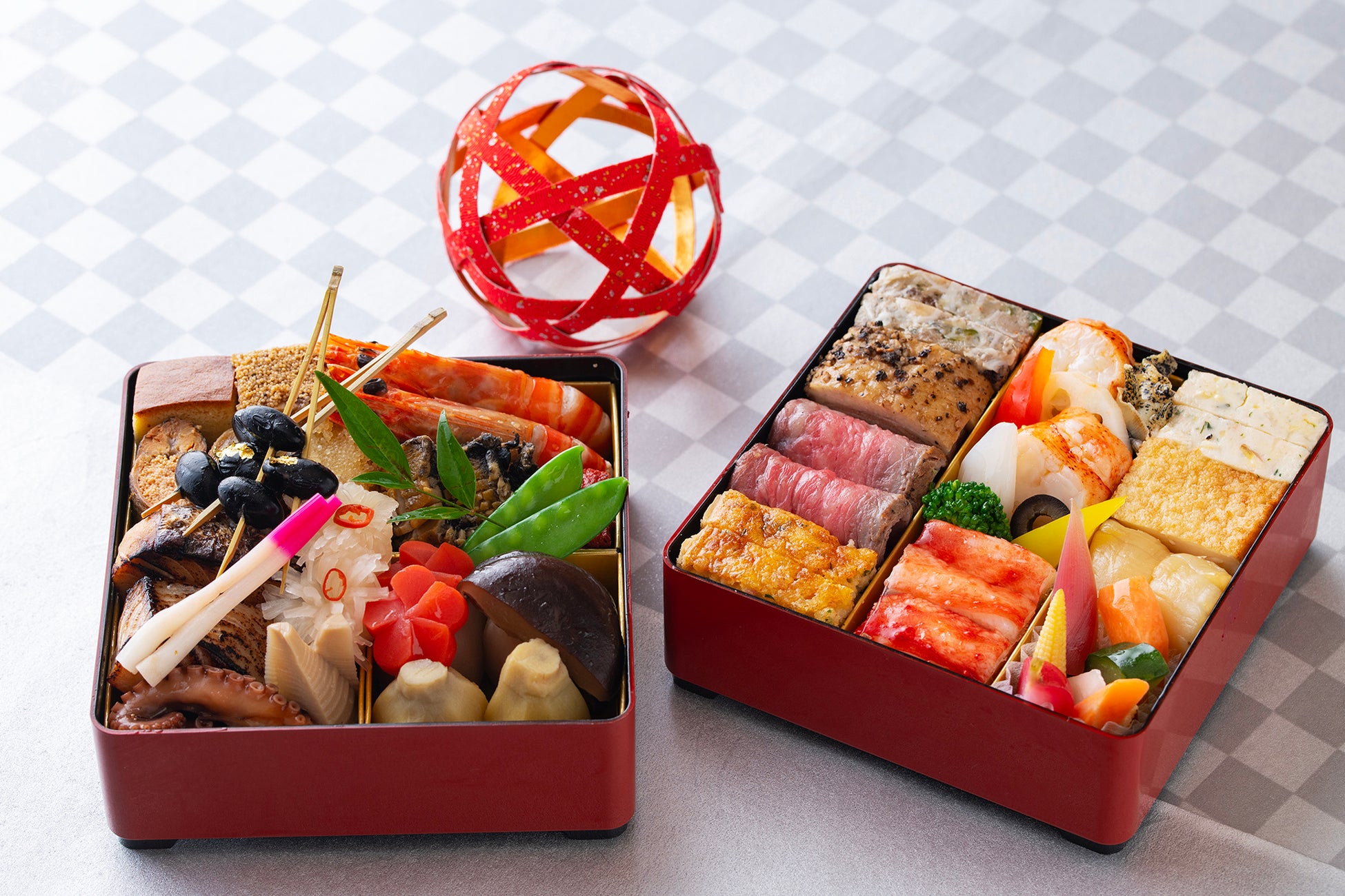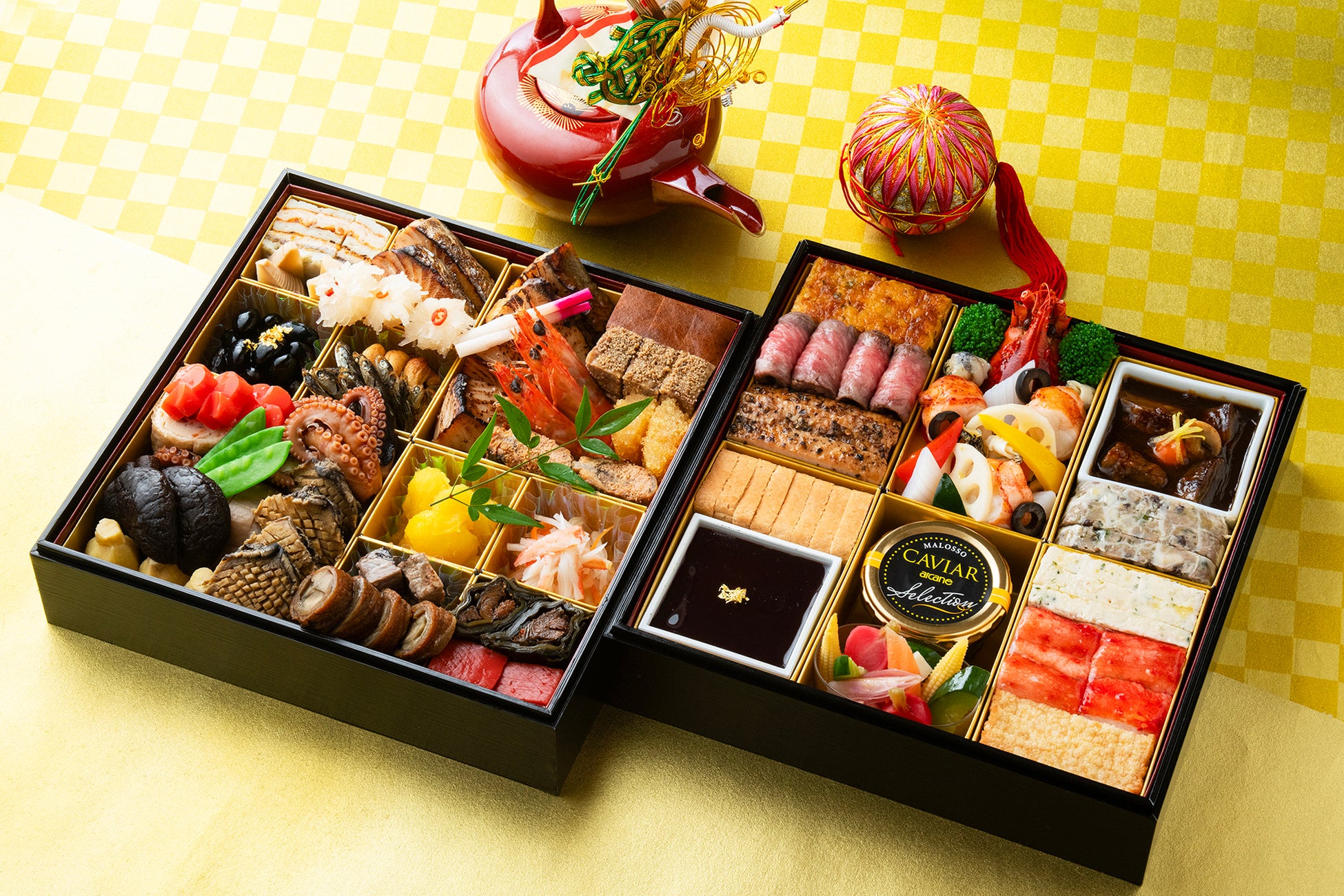 新年を華やかに彩るおせち。縁起物とされる伝統的な正月料理を盛り込んだ日本料理と、オマール海老やたらば蟹、フォワグラ、黒毛和牛など、山海の幸を贅沢に使用した西洋料理をご用意します。