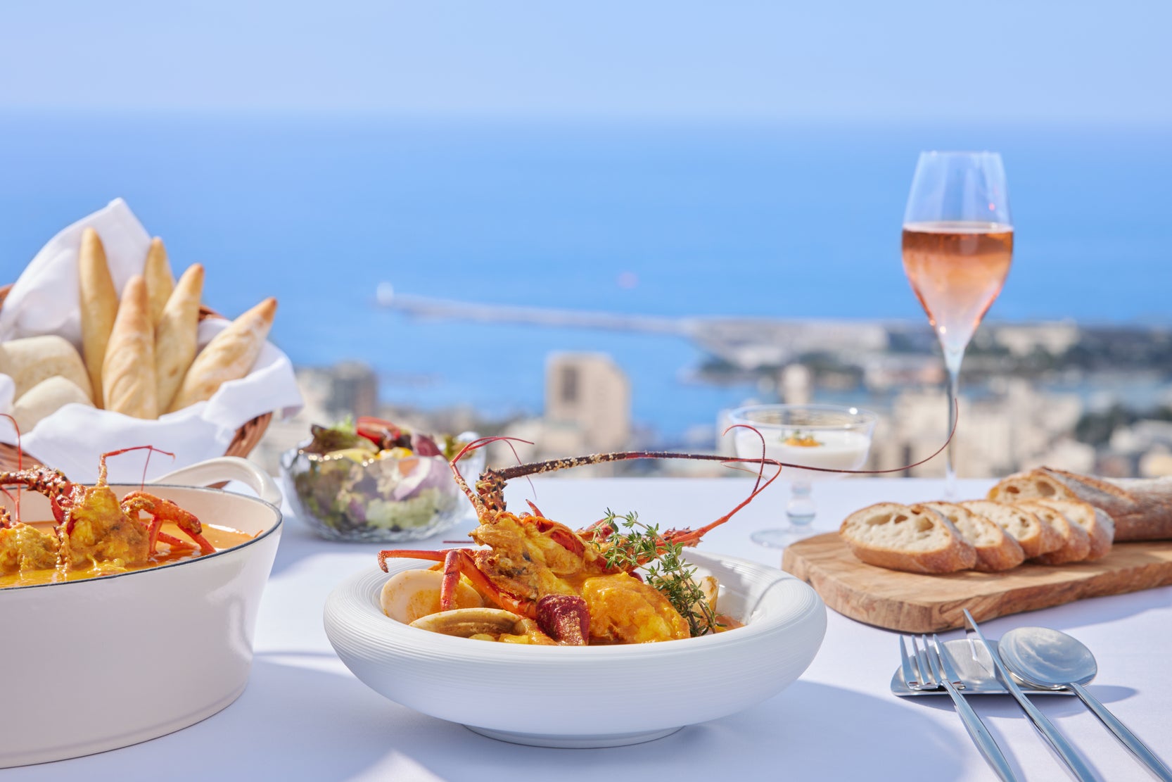 漁体験の後は、客室のテラスで絶景を眺めながら、「獲れたてイセエビ朝食」を堪能します。メイン料理は、自分で獲った伊勢海老をまるごと使用したズッパディペッシェです。イタリアで漁師料理と言われるズッパディペッシェには、伊勢海老に加えて、伊豆にちなんだ金目鯛を使用しています。伊勢海老の甘みと濃厚な旨味が凝縮されたスープは、華やかな香りのロゼシャンパンとも相性抜群です。熱海の街と海を眺めながら、自分で獲った伊勢海老を味わう特別なひとときを過ごせます。