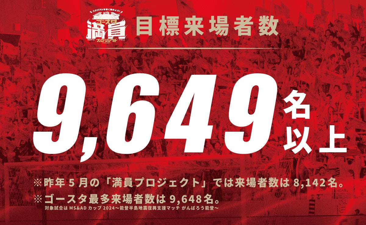 5月6日(火祝)は、ゴースタ過去最多となる9,649名以上の来場者数の突破を目標に、クラブはもとより、サポーターの皆様もぜひ周りの方をお誘い合わせの上、ご来場をお願いいたします。