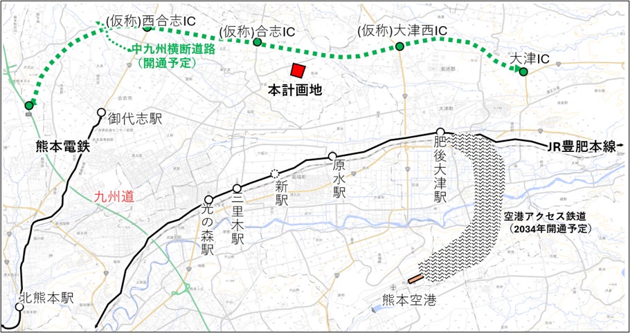 周辺県道の新設・拡幅とともに整備中の中九州横断道路(仮称)合志ICより約2kmに位置し、また、阿蘇くまもと空港(本プロジェクト予定地より約12km、当社が筆頭株主である熊本国際空港株式会社が運営)と豊肥本線を結ぶ空港アクセス鉄道(2034年開通予定)も計画されるなど、広域交通アクセスに恵まれています。