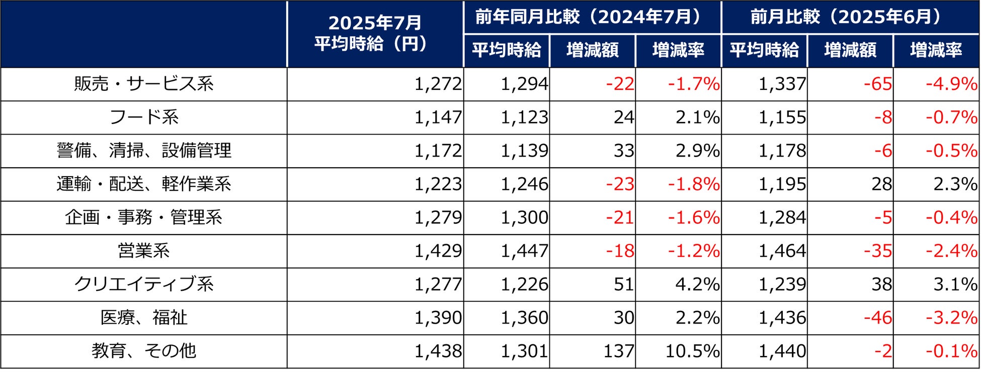 職種別平均時給、【フード系】【警備、清掃、設備管理】など5職種で前年同月比プラス。