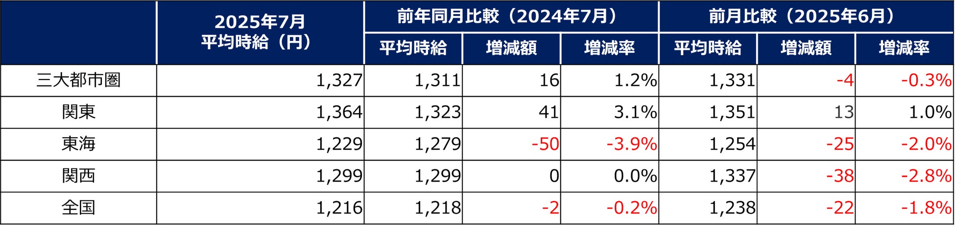 7月度のエリア別平均アルバイト時給は、三大都市圏、関東エリアで前年同月を上回る。