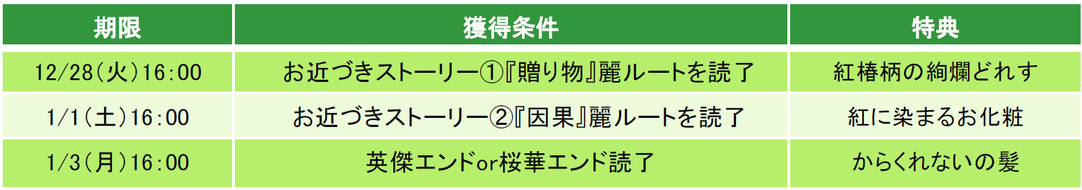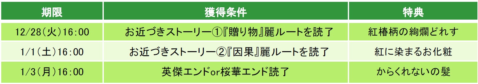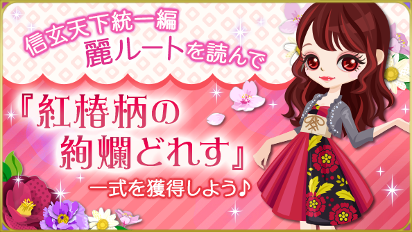 天下統一編ストーリーのボイス実装に合わせて、アプリ内でキャンペーンを開催いたします。本キャンペーンでは、期間中に武田信玄の続編ストーリー・麗ルートを指定箇所まで期限内に読み終えると「紅椿柄の絢爛どれす」一式が手に入ります。この機会にぜひ、武田信玄の天下統一編ストーリーを素敵なボイス付きでお楽しみください。