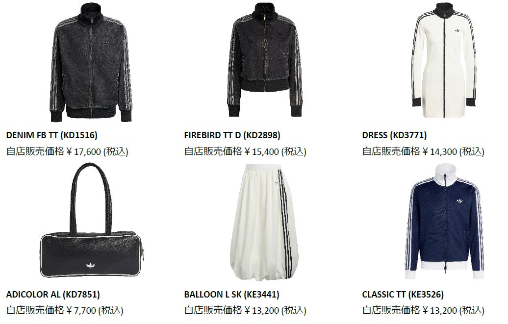 これらに加え、adicolorコレクションのひとつでアイコニックなFIREBIRDに新鮮なひねりを加えたドレスやレトロスタイルのクラシック トラックトップCLASSIC TT(クラシック トラックトップ)、サッカーとファッションをボリュームのあるフォルムに融合させたBALLOON L SK(バルーン ロング スカート)などのアパレルアイテムが展開されます。