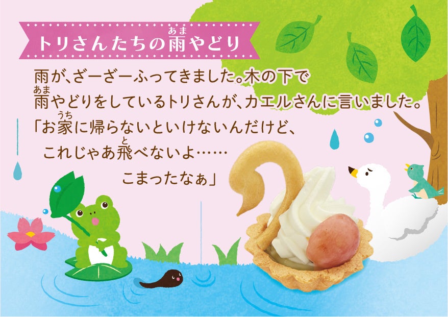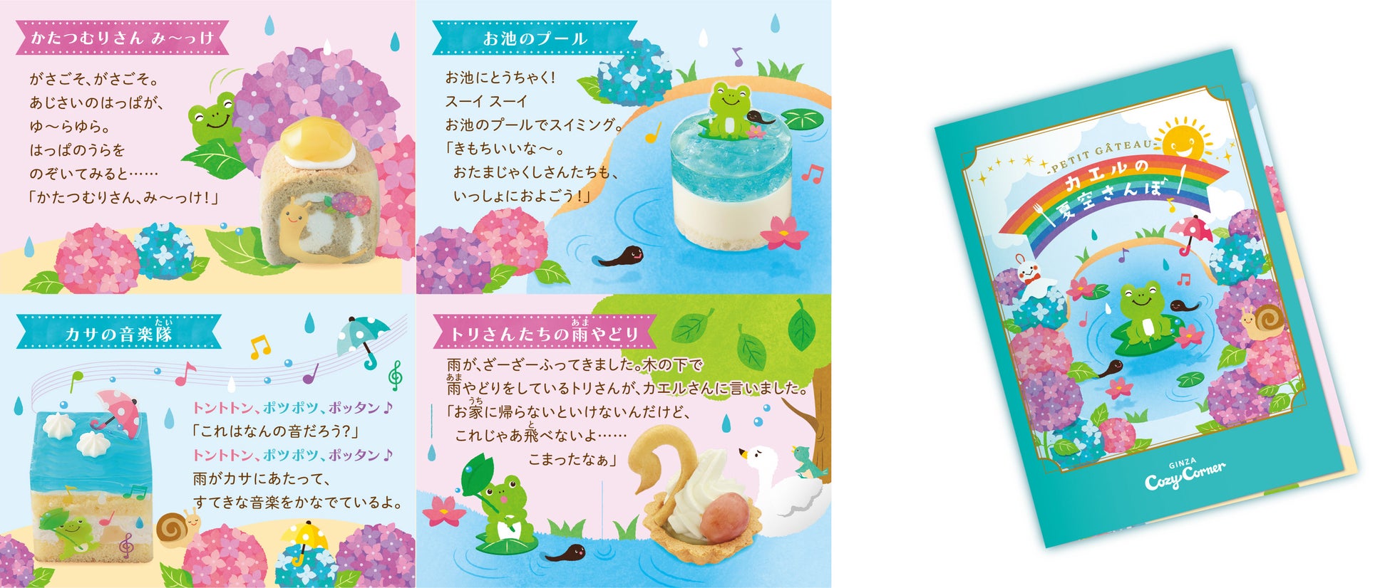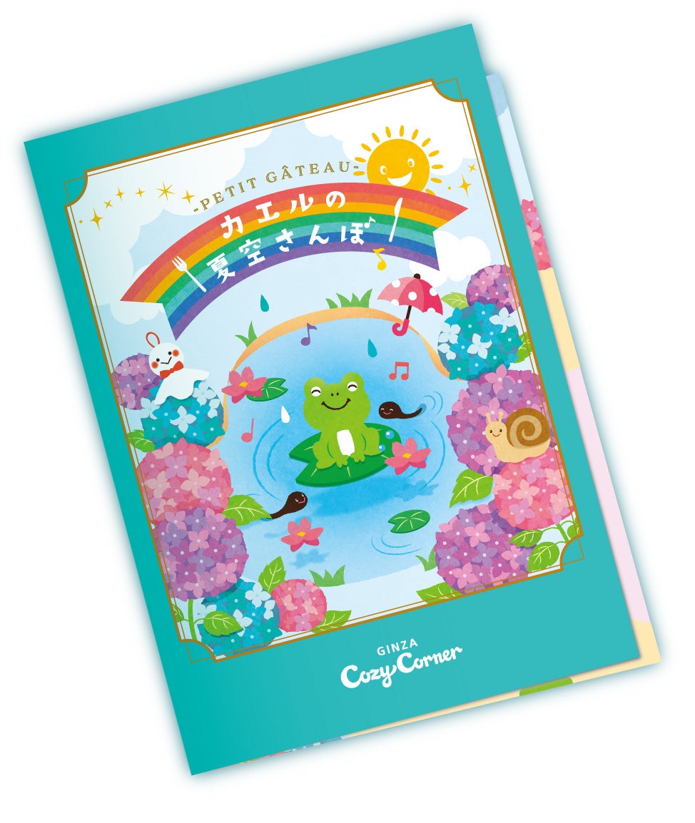 「カエルの夏空さんぽ」の物語を1枚の絵本風リーフレットにしました。お話とプチケーキがページごとに載っており、みんなで物語を読みながらそれぞれのケーキをお楽しみいただけます。