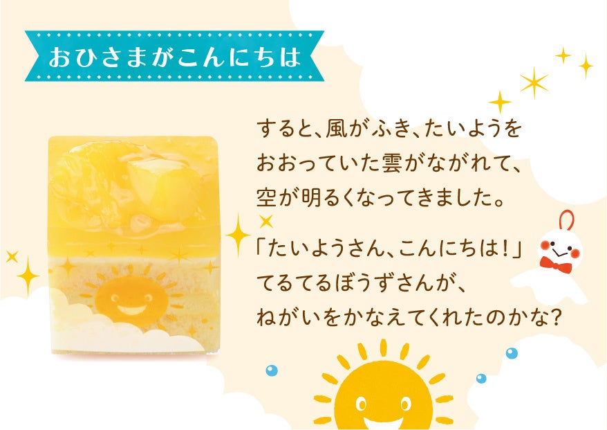 すると、風がふき、たいようをおおっていた雲がながれて、空が明るくなってきました。「たいようさん、こんにちは!」てるてるぼうずさんが、ねがいをかなえてくれたのかな?