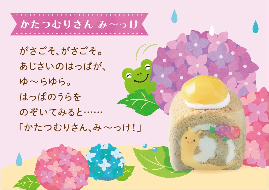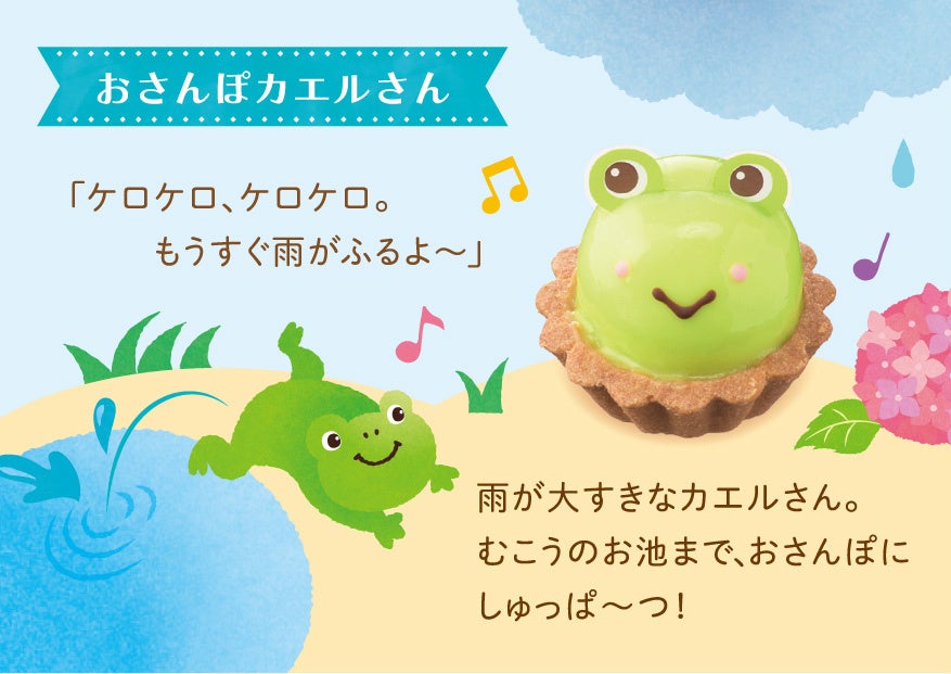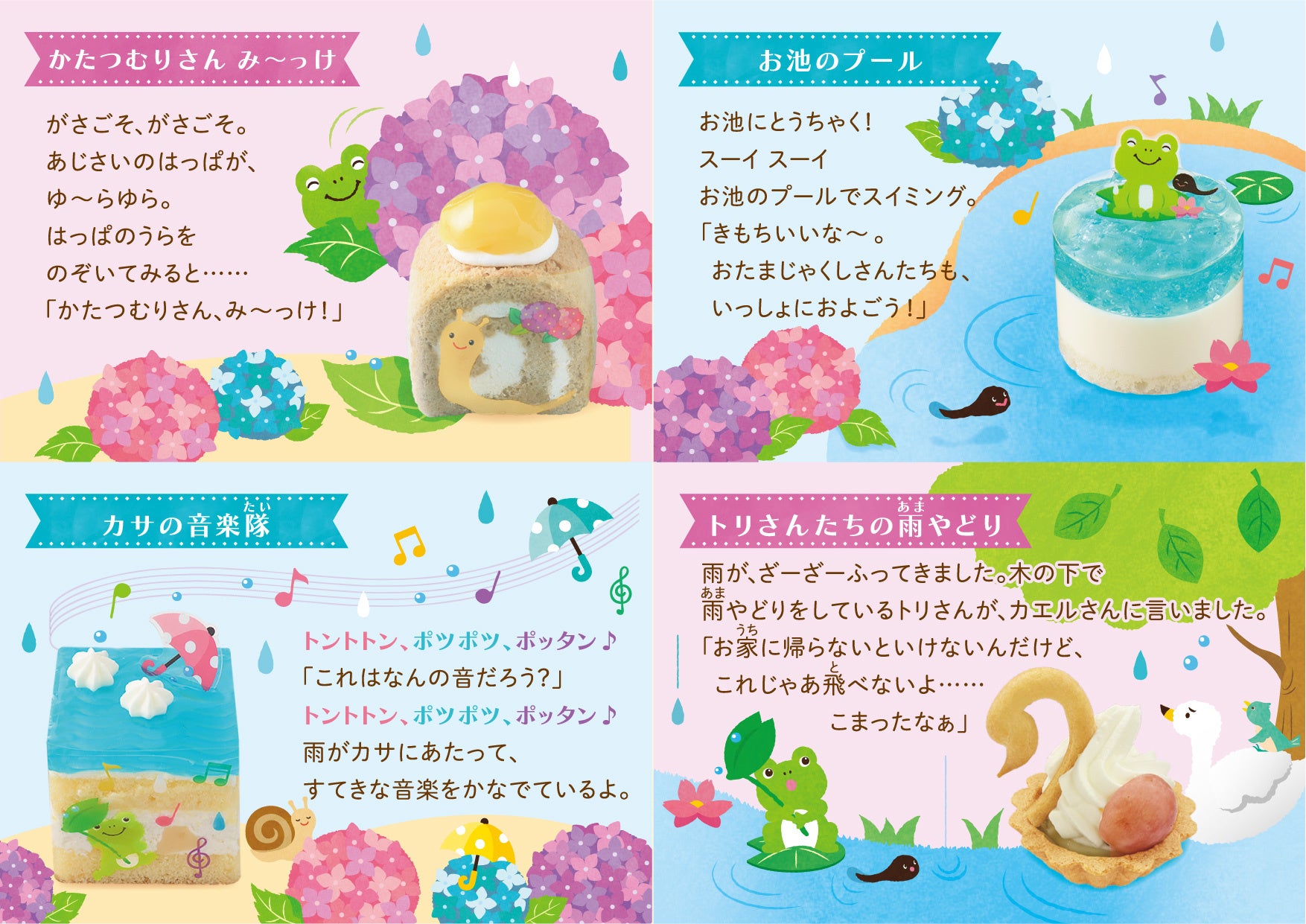 カエルさんが楽しく散歩する様子を、季節のフルーツを取り入れた9つのプチケーキで表現。その1つ1つにはストーリーがあり、例えば、雨に濡れてキラキラ輝くあじさいはぶどうやブルーベリーを使ったゼリーで、雨の後に顔を出したおひさまはマンゴーやオレンジを使ったケーキで表現しています。