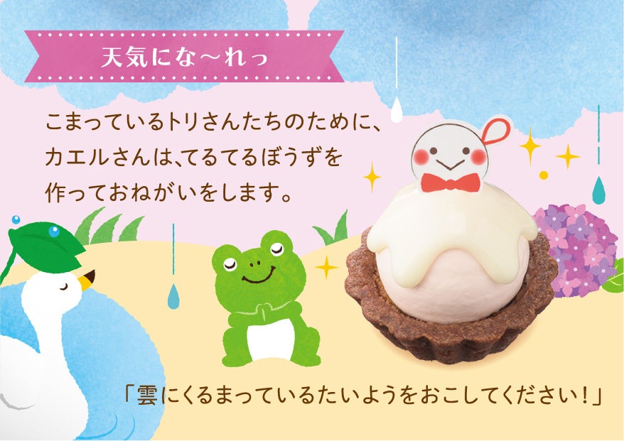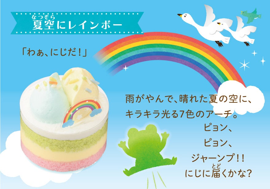 夏に向かってだんだんと暑くなる季節に、マンゴーやメロン、ぶどう、白桃など、おいしい夏の味覚を、ストーリー仕立てのケーキでお楽しみいただけたらと思い開発しました。天気が移り変わる中でウキウキとカエルさんがお散歩している様子を表現。お子様との会話のきっかけにスイーツを通しておいしく、楽しく、”季節”を感じていただけたらと思います。
