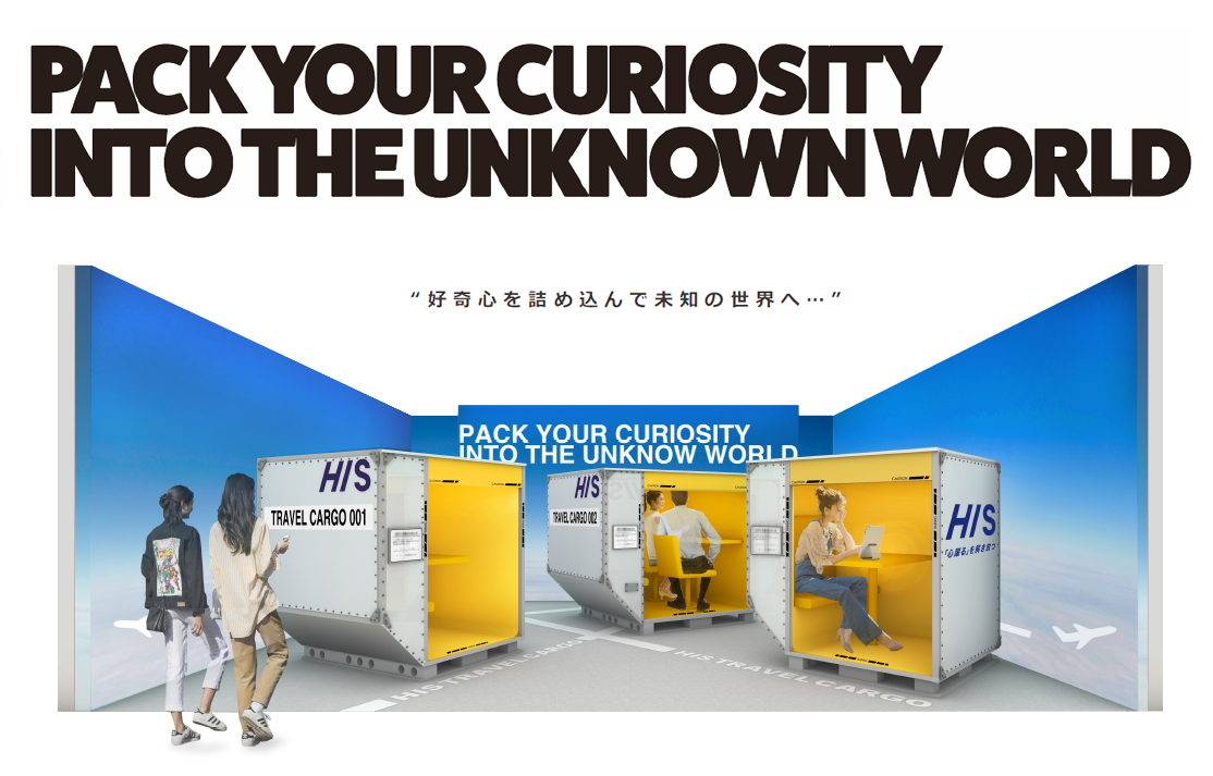 コンセプトは「好奇心を詰め込んで未知の世界へ・・・」。大空に囲まれた空間に、航空会社で使用されていた航空カーゴを再利用し、旅行相談のカウンターブースとして設置しております。数多く世界を旅してきたカーゴから、お客様の次の旅の想像をさらに後押ししたいと考えております。