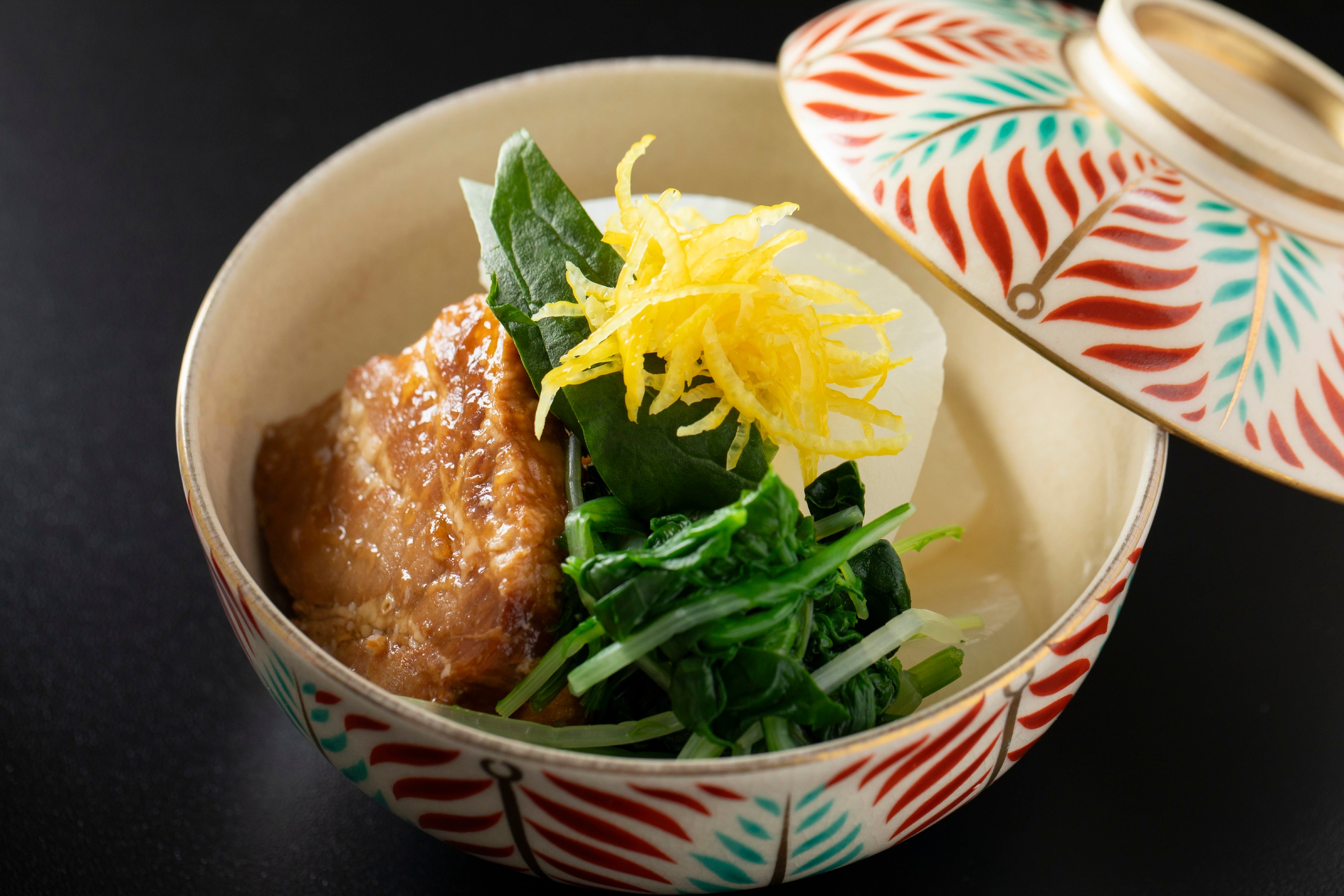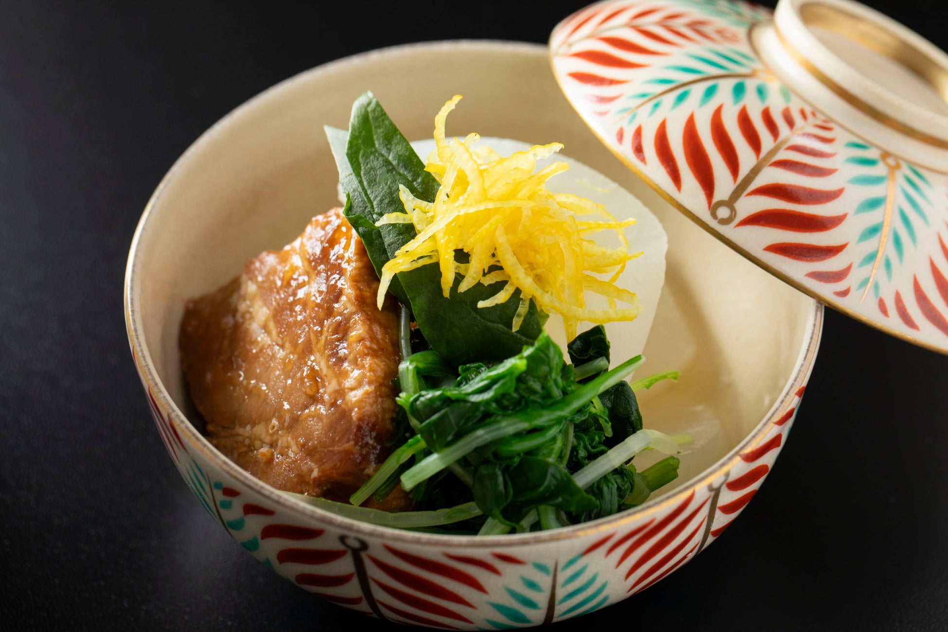 聖護院だいこん・京壬生菜・京みず菜 豚角煮の炊き合わせ (京懐石 美濃吉本店 竹茂楼) |