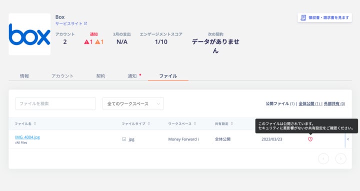3.検知された公開ファイルが、SaaS管理画面上でアラート表示