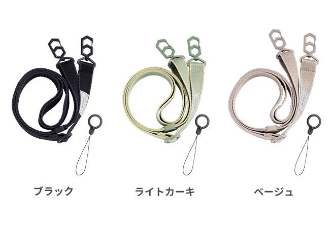 さらにストラップホールがあるスマホケース用に接続用ストラップを付属。接続用ストラップのリング部分にショルダーストラップ両端のカラビナを掛けることでななめ掛けができます。