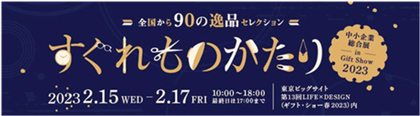 「中小企業総合展 in Gift Show 2023」では、株式会社ビジネスガイド社が主催する日本最大のパーソナルギフトと生活雑貨の国際見本市「第13回LIFE×DESIGN(ギフト・ショー春2023)」内に“すぐれものがたり”となる90社の出展ブースを設け、日本全国の中小企業が自ら企画開発・製造した、ギフト・雑貨分野の商品を一堂に展示します。展示会を通じ、国内外バイヤーとの商談機会を創出することで、中小企業の販路開拓、さらなる事業成長に繋げることを目的として開催します。