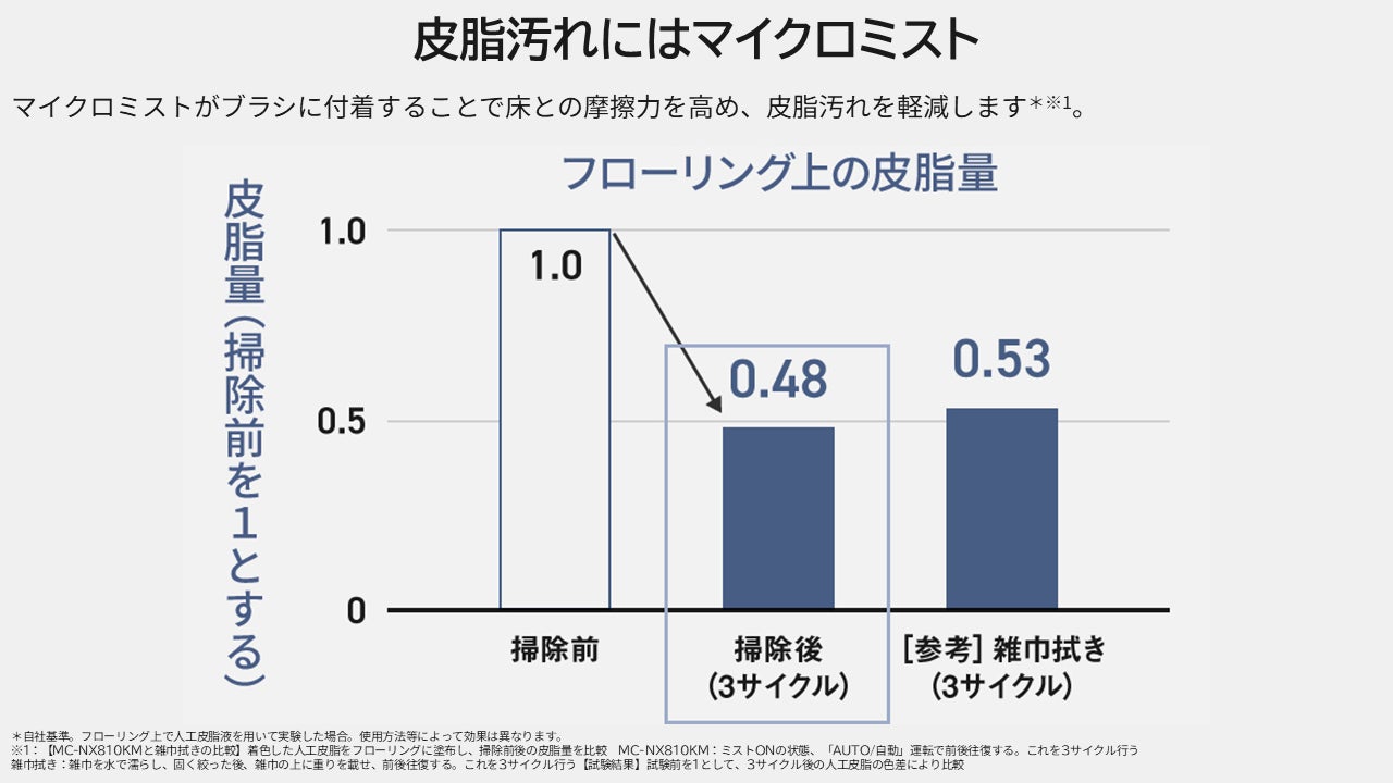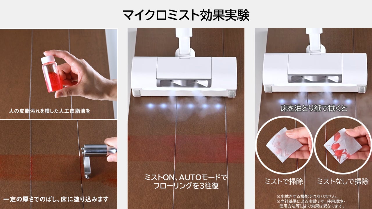 このマイクロミストをノズル前面から噴霧して、フローリングの皮脂汚れに吸着。これまでの掃除機では取り切れなかった皮脂汚れまで、しっかりキレイにできます。