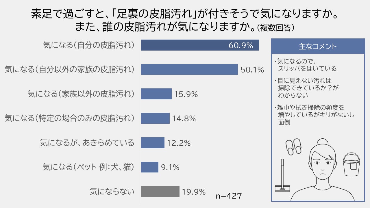 今回の調査では、素足で過ごすと、フローリングに自分や家族の「足裏の皮脂汚れ」が付きそうで気になる方は半数以上いることがわかりました。また、フローリングで過ごす状況で「掃除する際の困りごと」について質問したところ、「目に見えない汚れは掃除できているかがわからない」「雑巾や拭き掃除の頻度を増やしているがキリがないし面倒」などの声がありました。