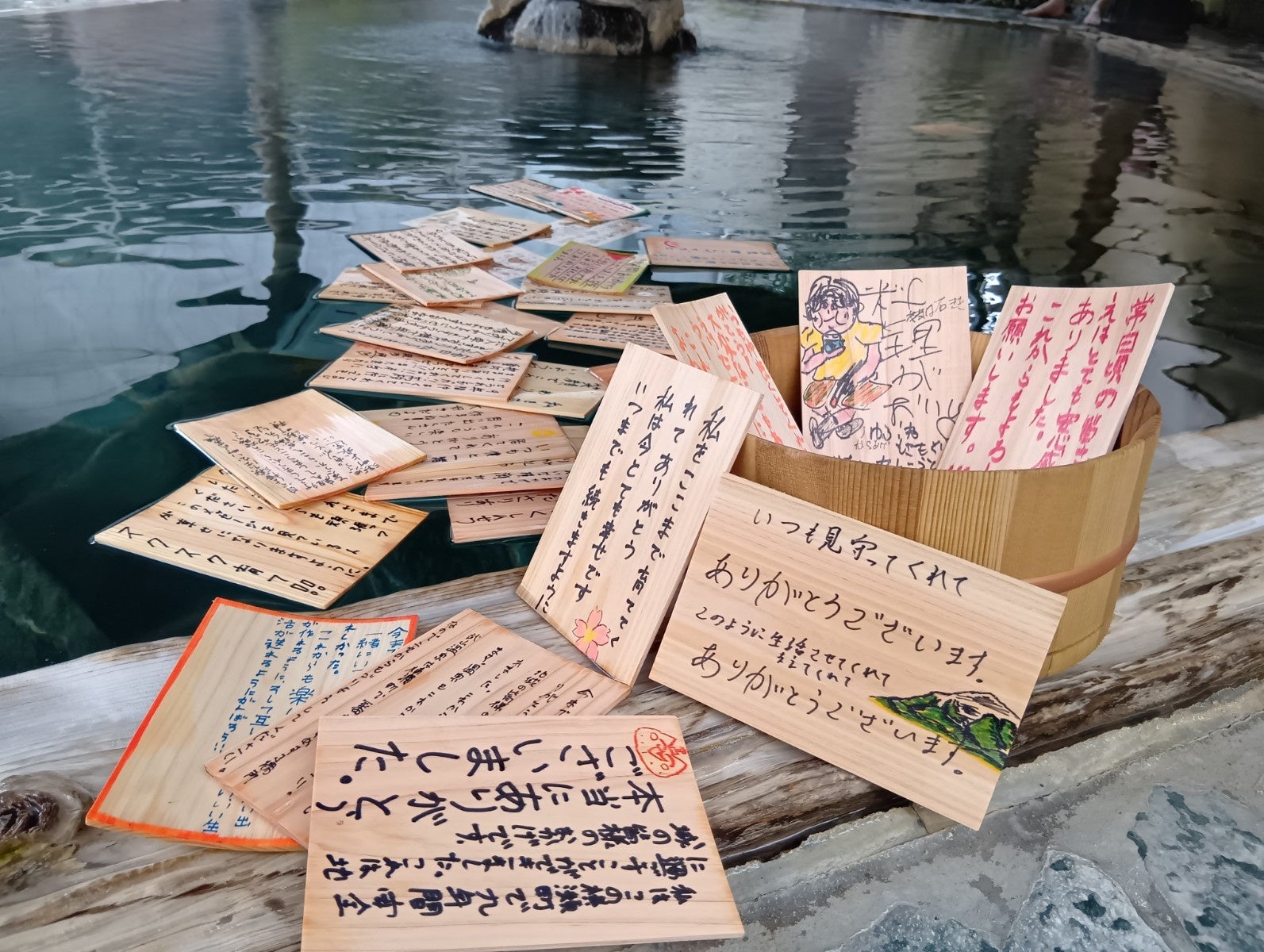 玉川温泉と武甲温泉のスタッフが地元の中学校を訪問し、今年の卒業生に「地域の方に向けた感謝のメッセージ」をヒノキの入浴木に書いてもらいました。メッセージ入りのヒノキ入浴木は、お風呂に浮かべます。お風呂で地域の子供達からのメッセージを読んで、ほっこりとした気持ちになっていただきたいと思います。